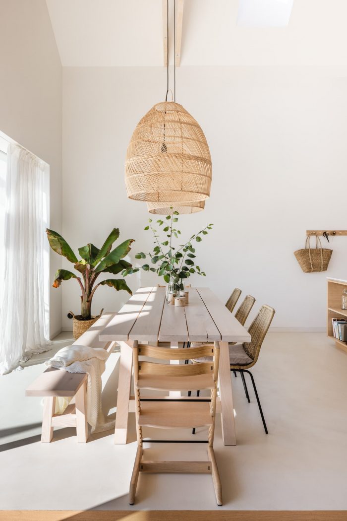 Opening in almost the entire width of the gable wall, connects the living room, dining room, and kitchen with a large covered terrace. The spaces on the ground floor and first floor are connected by an open gallery. A single-arm staircase leads to the attic accessible from the children's room, the ceiling of which is open and filled with a walking net. It expands the living area while maintaining the connection between the zones of the children's room. On the first floor, there is a gallery and a separate room - a sleeping area for children.