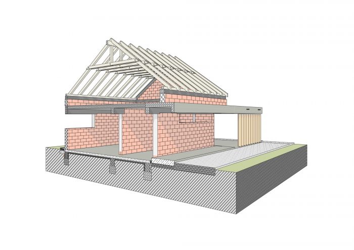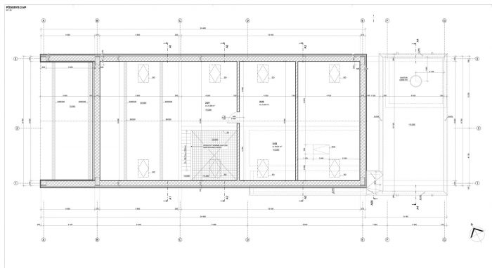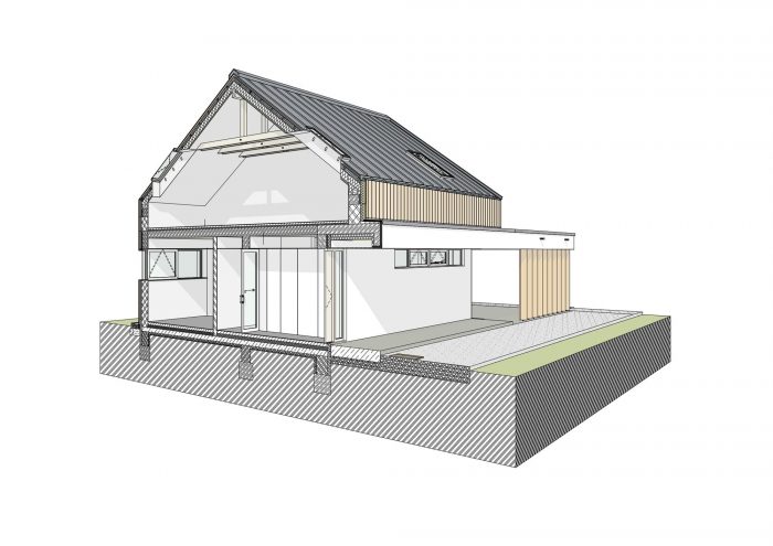 Disposition. The house is entered from the covered leeward side along the southeast facade. The vestibule gives access to the technological block and leads to the main corridor on the ground floor. Directly opposite the entrance area, there is an atelier, a separate toilet, and next to it a bathroom for children. The architects located the bedroom with its own bathroom and wardrobe in the northeastern part of the floor plan. The day zone of the house is open space over two floors up to the truss of the gable roof with a visible construction.