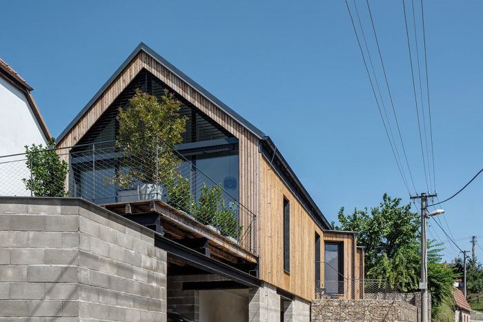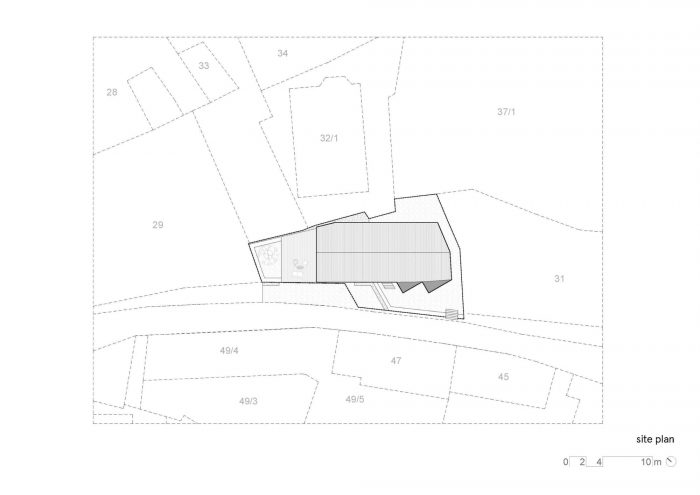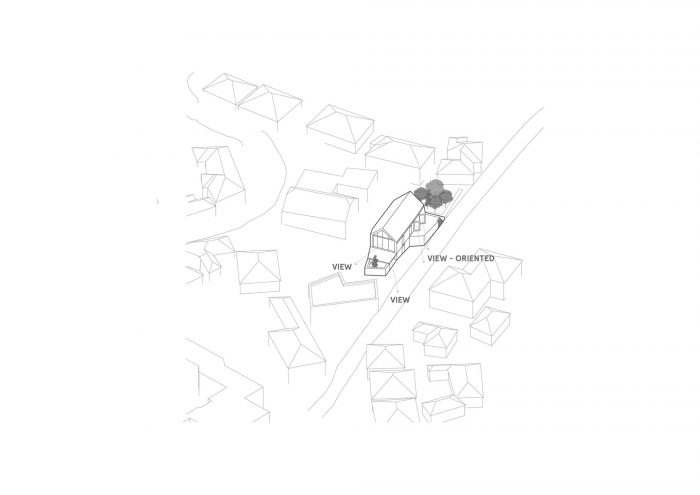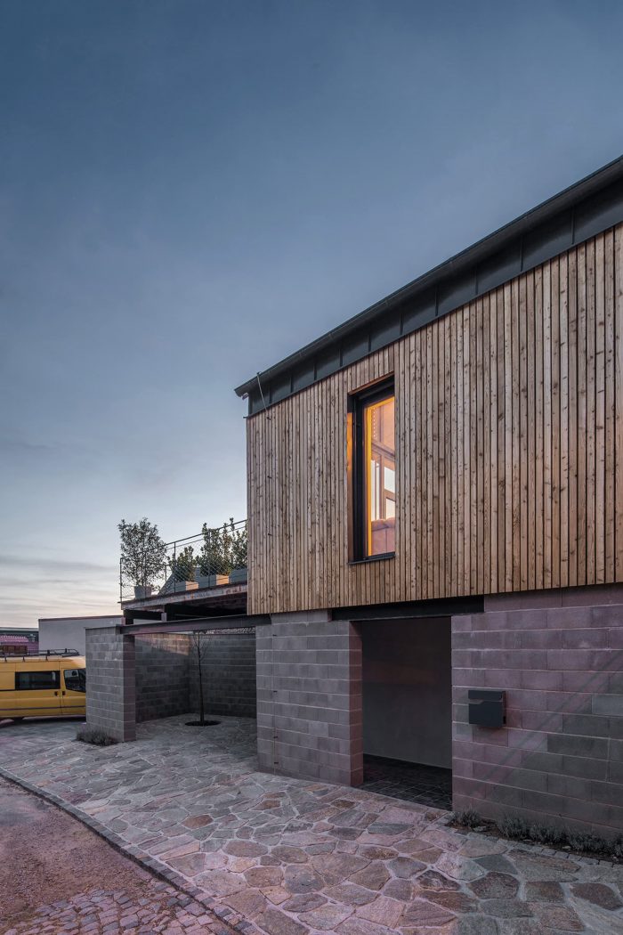 Story. View. That was an element that played a significant role on the property. But how to ensure a view from all rooms when the property tapers conically towards the view? The basis of the design of the house in the very densely built-up area of a picturesque Moravian village is a simple rectangular mass loosely placed on the slope. Thanks to this, a covered parking space is naturally created in the lower part and a connected covered entrance to the residential areas. The individual bedrooms are slightly rotated in the floor plan, and can thus open to views of the semi-trailer through narrow windows.