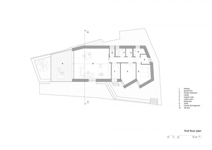 故事。景观。这是一个在该地块上起重要作用的元素。但是,当房产向风景的方向呈锥形时,如何确保所有房间都能看到风景? 在一个风景如画的摩拉维亚村庄的非常密集的建筑区,房子的设计基础是一个简单的矩形体,松散地放在斜坡上。正因为如此,在下部自然形成了一个有顶的停车空间,以及一个连接到住宅区的有顶入口。 各个卧室在平面图中略微旋转,因此可以通过狭窄的窗户看到半拖车的景色。
