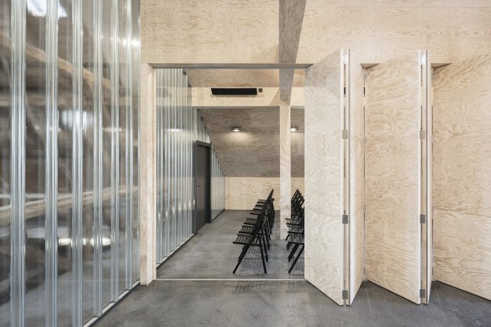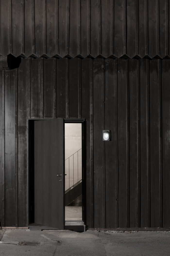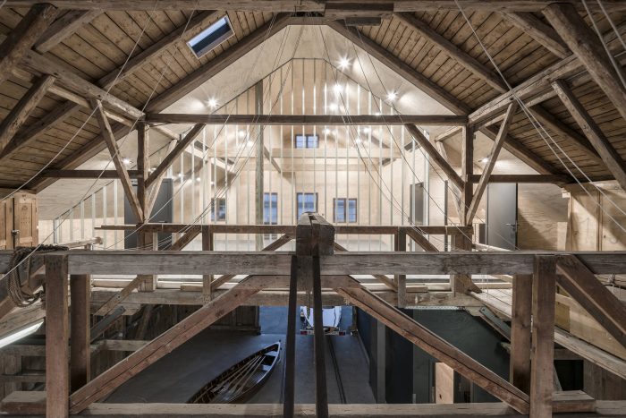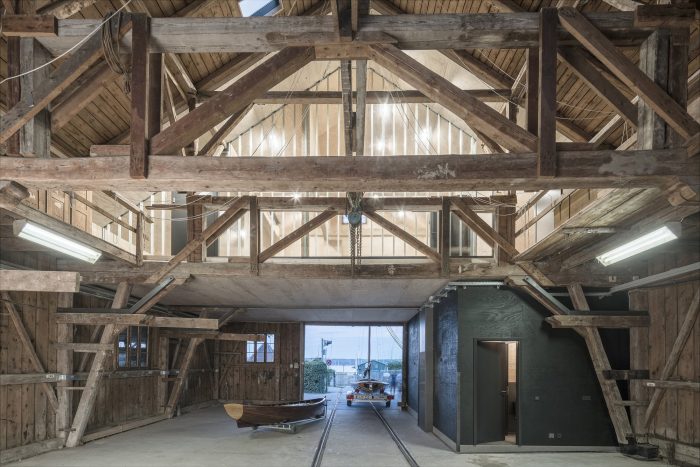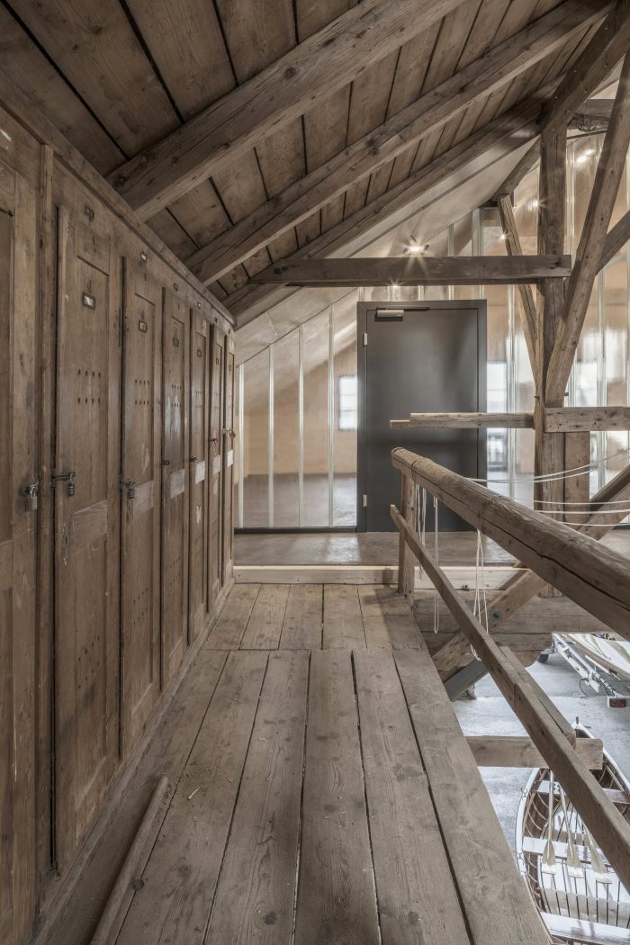 On the contrary, all existing conversion work was dismantled, laying bare the building’s original structure. A house-in-house concept was then realized. Whereas the majority of the available space is still used as a boathouse and as storage space, the side of the roof facing the lake was converted into a room in its own right. The resulting area was separated from the main hall by a floor-to-ceiling wall made of profiled glass. On this side, Lake Ammer is visible through the historical façade. The young sailors are thus trained in a fitting setting, between the now visible sail storage section and the lake. If necessary, the training room can be divided up by means of a wooden accordion partition. Underneath this room, a “black box” was positioned at the edge of the hall. This contains not only the entrance area but also a steel staircase leading to the upper level and the new toilet facilities.