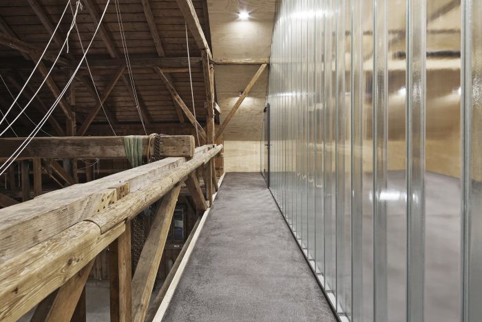 A space has thus been created without touching the existing structure for additional use, one that is line with the plans to sustainably adapt the building to future requirements. Sustainable and renewable raw materials were used in the execution of these plans and the materials were not chemically treated. In dialog with the existing building and in order to clearly distinguish the alterations, all the cladding and surfaces were realized in Aleppo pine. This gave the room a peaceful feel and contrasted with the historical roof truss. The conversion work can only be guessed at from the outside. On the inside, a stimulating ensemble is created, while the impression of the hall as a whole remains perceptible.