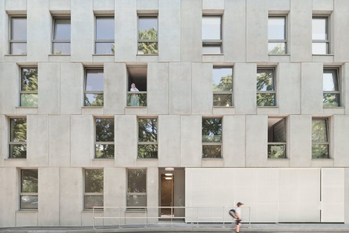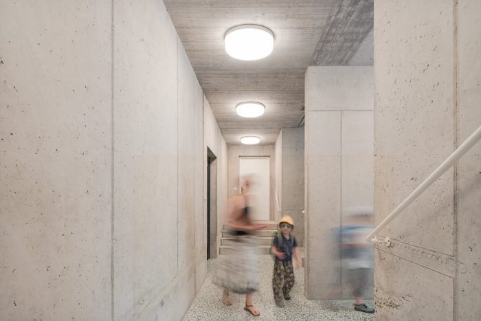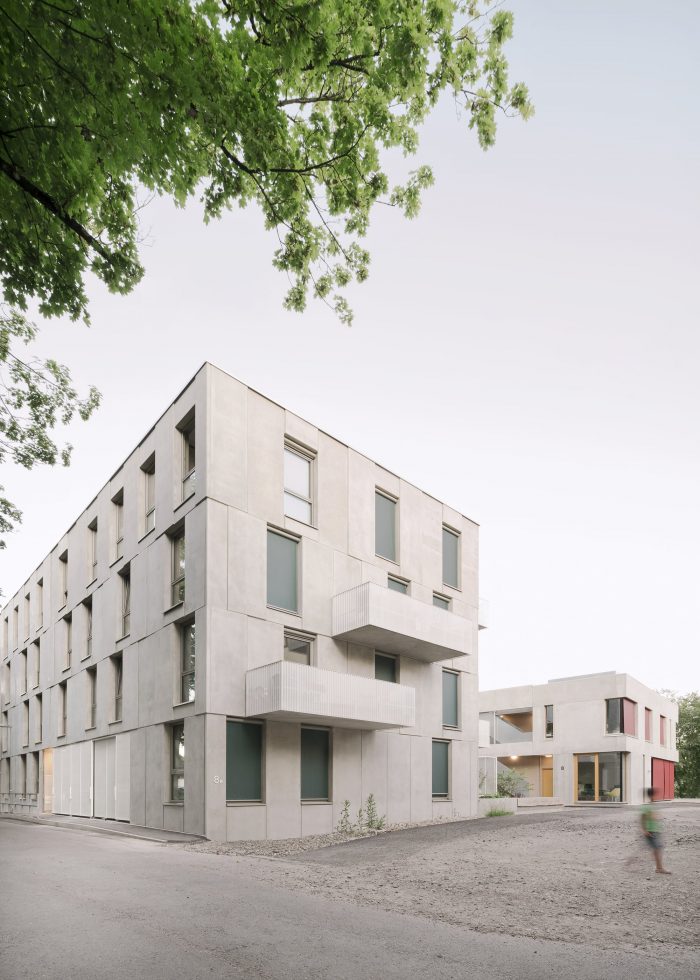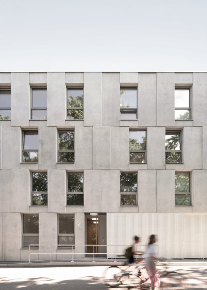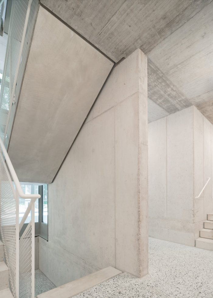 The outer wall of core-insulated prefabricated concrete elements is the primary load-bearing component. Its prominent position in the tectonics of the building is expressed in the regular pattern in which the uniform concrete formats project and recede from the façade and the way they are offset floor-by-floor, similar to a masonry bond. Through the formal emphasis of the structure, it is both construction and cladding. Rhythmically placed windows fit into the grid.