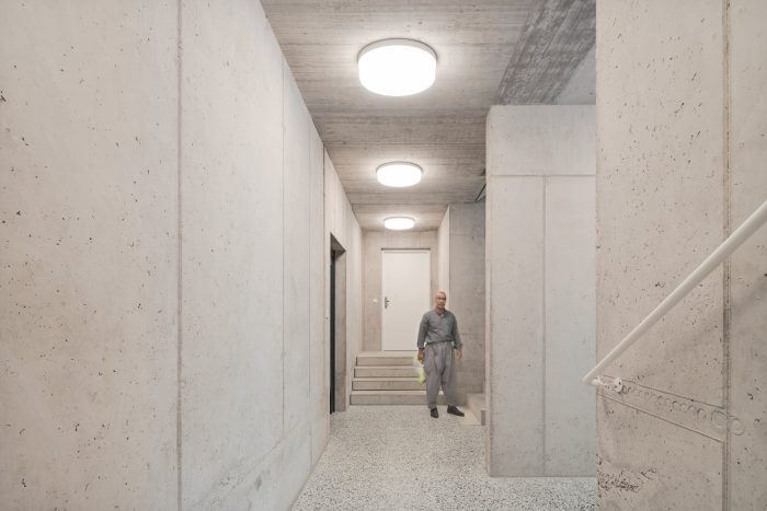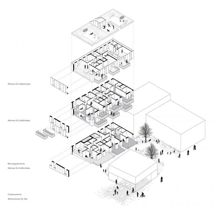 The load-bearing elements have been reduced to a minimum in the robust architectural structure. This enables versatile floor plans and residential uses to adapt to changing living requirements and therefore creates long-term sustainability. An apartment for refugees with up to 6 rooms can be turned into an open loft, the micro-housing units can be connected to form a student flat share.