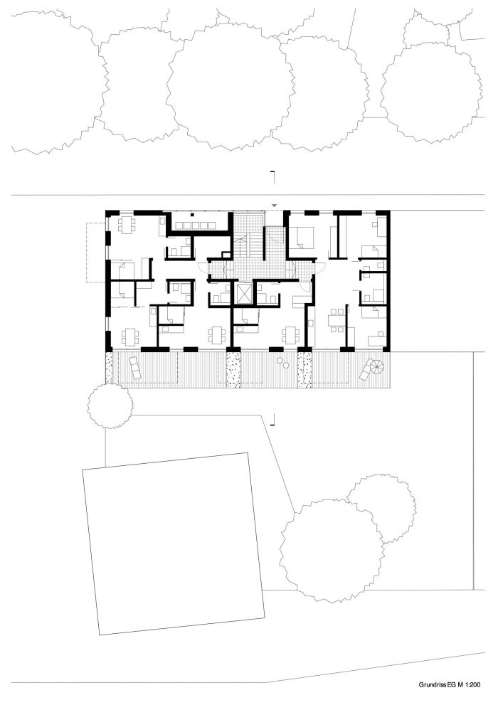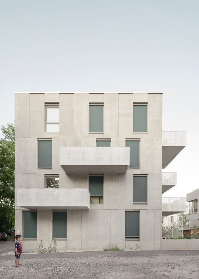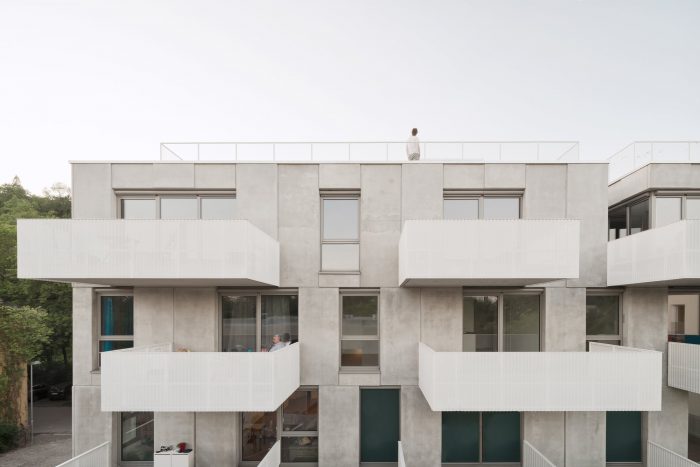 The formal precision, the focus on selected spatial elements and the reduction to just a few different materials create a spatial quality and character that benefits all users equally, even within the tight budget. On arrival, the extra-high, retracted entrance area already conveys a spatial generosity. Raw concrete, greenish terrazzo tiles and the white-painted railing create the atmospheric framework in the staircase between light elegance and robust rigidity. In the apartments, large, floor-to-ceiling openings in all rooms create a bright, friendly atmosphere and bring the lush old tree population north of the building into the interior. Deep balconies face the river Neckar, extending the apartments with their own fully-fledged outdoor space. The light, wavy, white cladding of the balustrades creates both privacy and views thanks to the fine perforation of the sheet metal.