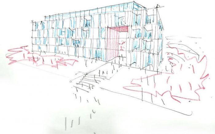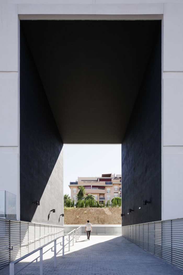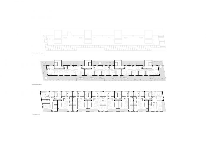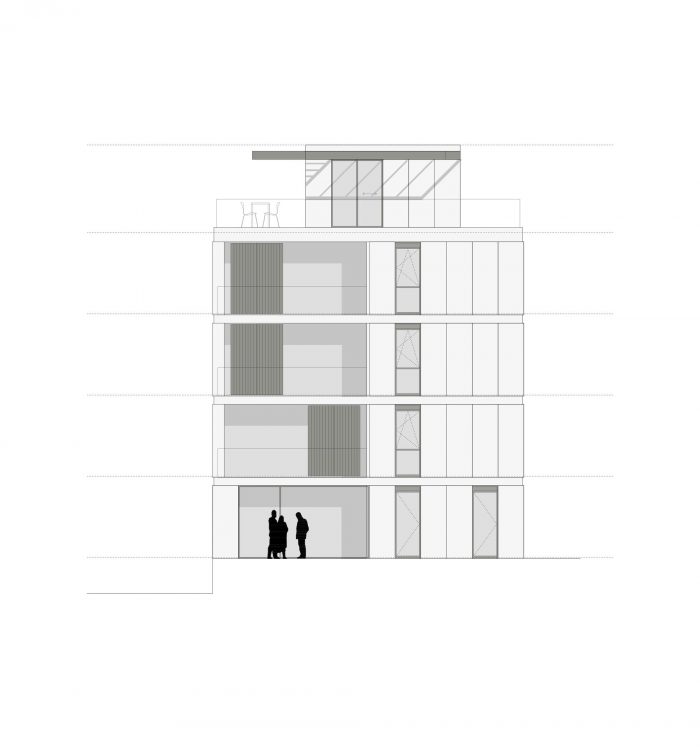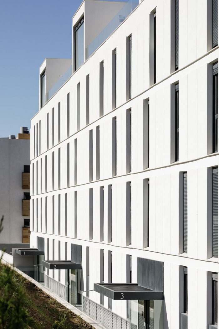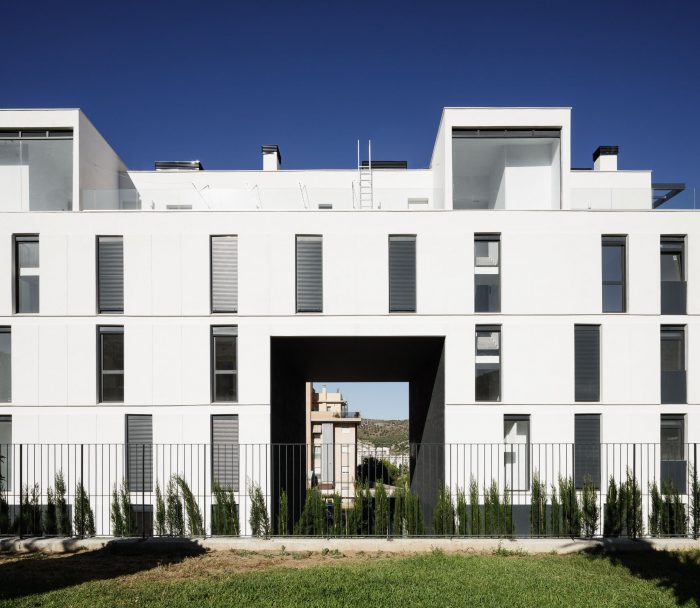The building sits on the uneven ground along its entire perimeter. This fact will determine its position and main access, formalized with a large opening in the volume. This perforation -the most outstanding morphological gesture of the project- intends the visual and physical permeability of the building from the street. An opening to the linear park that runs parallel to its back and that allows the building to be crossed to access the communication hubs directly and clearly. The building consists of 32 homes with 3 and 4 bedrooms spread over four floors plus an attic and is based, taking advantage of the existing topography, on a parking lot for 49 private spaces and 32 storage rooms from which you can access street level. The 4 communication cores will give access to the dwellings at a ratio of 2 for each floor.