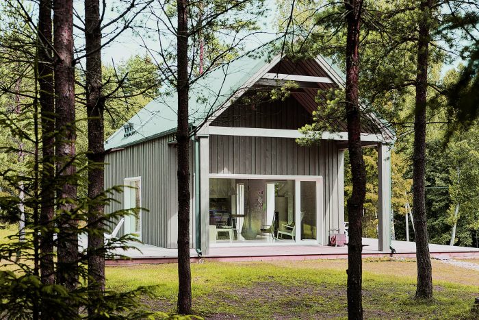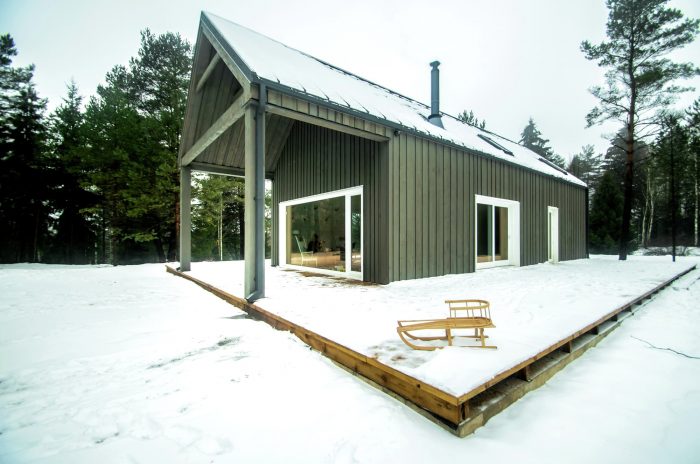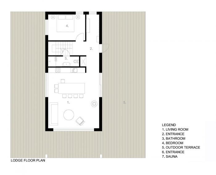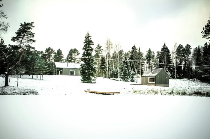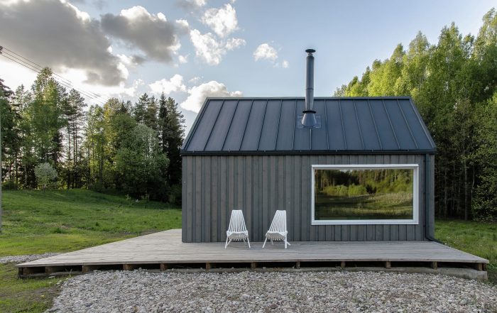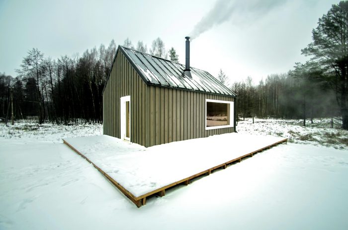A shelter for a hunter's family leisure time is located on a small hill in the deep Lithuanian forest. The chosen location is retreated and surrounded by trees in order to give a chance to hear the real sound of the nature. A main inspiration of the concept was a client's hobby - hunting.