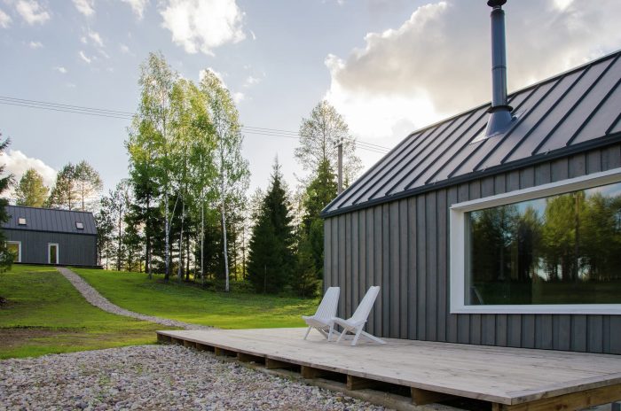 猎人家庭休闲的住所位于立陶宛森林深处的一座小山上。所选择的位置是隐蔽的,被树木所包围,以便有机会听到大自然的真实声音。这个概念的主要灵感来自于客户的爱好--打猎。