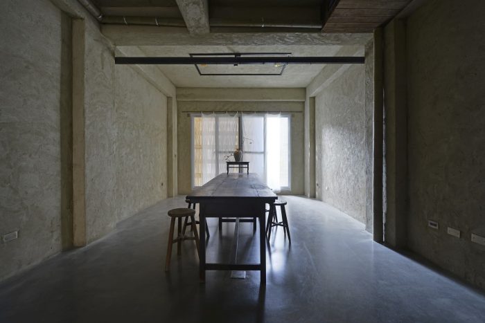 室内墙面的涂料是用泥土、白水泥和稻杆混合而成,在墙面上形成未经修饰的纹理,留下手工制作的余温。室内包含了许多台湾土屋的元素。在一楼的后面设计了一个小茶馆,它是由木头和水泥制成的。进入时,需要弯下腰,通过一个小门进入两层楼的空间。屋顶是45度的倾斜屋顶,在屋檐和墙壁之间设计了一排天窗,引入自然光。让光和影在墙上随时间移动。