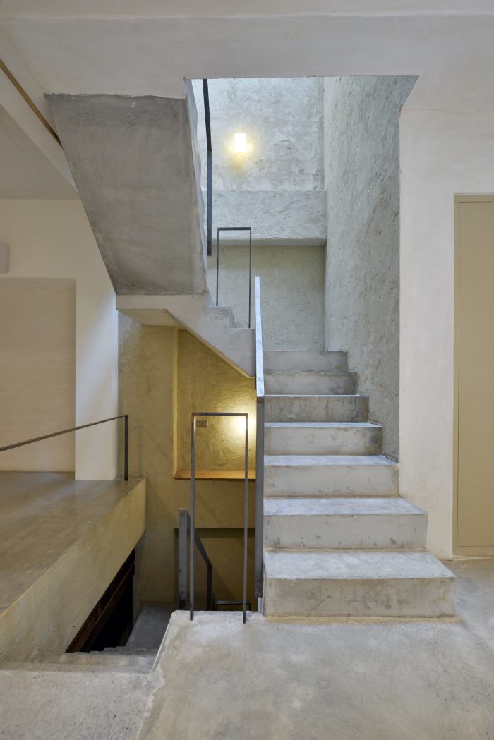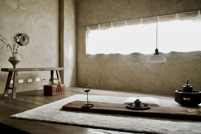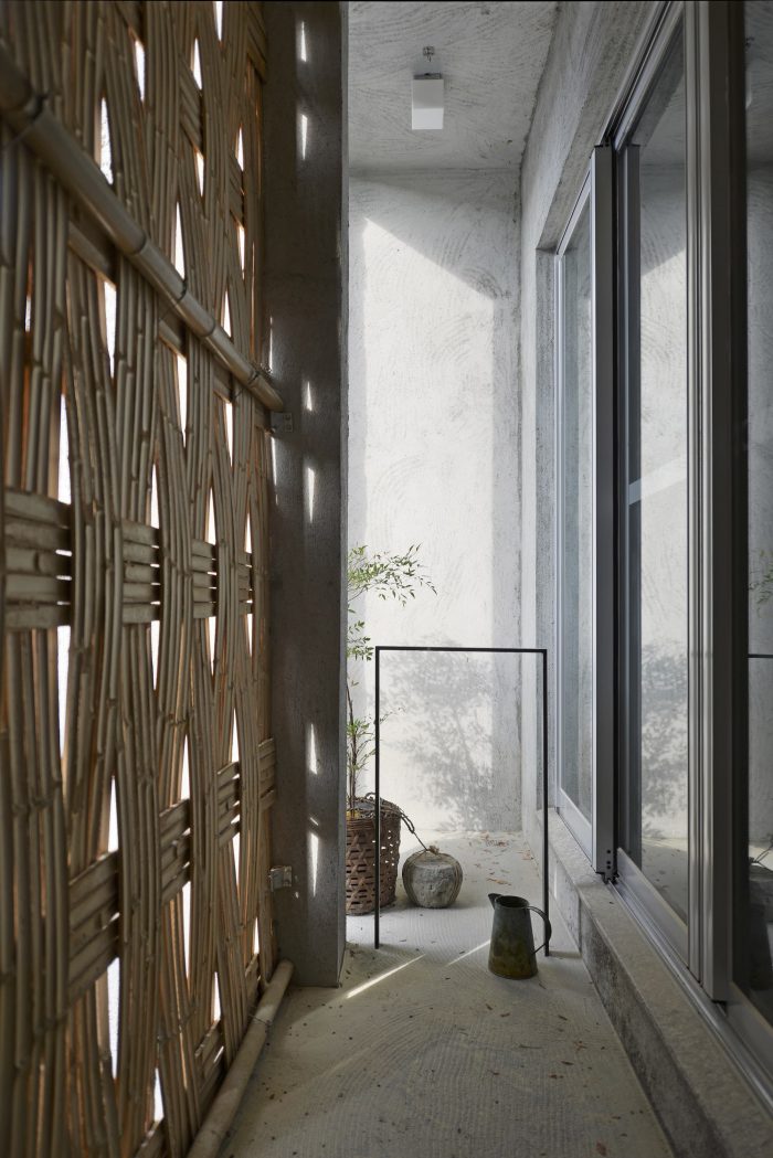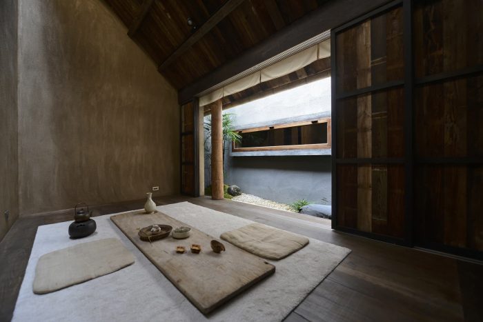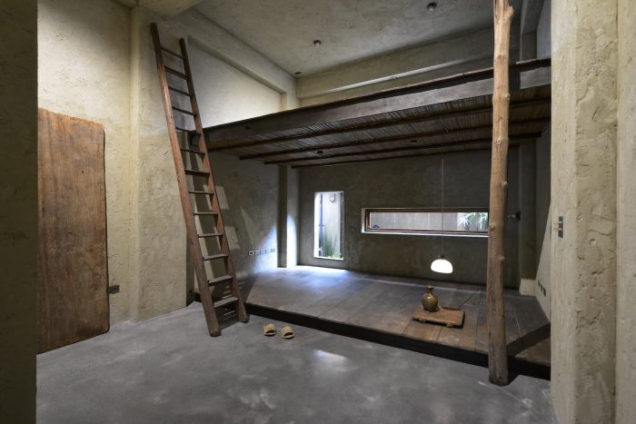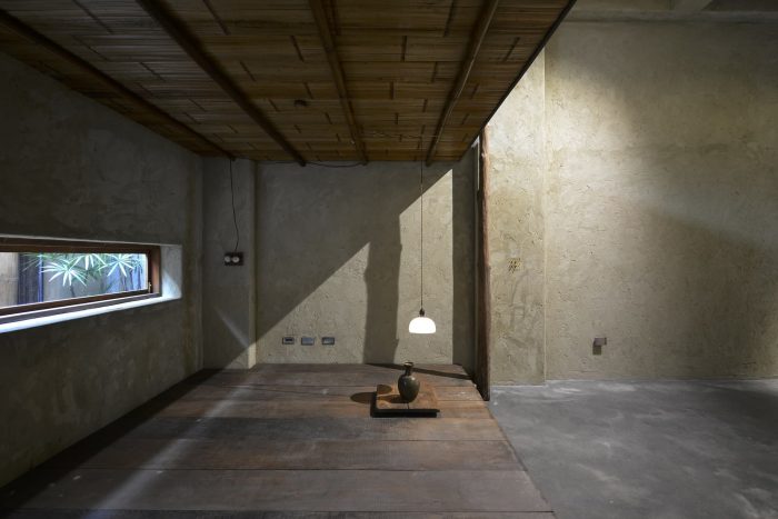 The paint on the interior walls is mixed with soil, white cement, and rice stalks to create an unmodified texture on the walls, leaving a hand-made residual warmth. The interior contains many elements of Taiwanese earthen houses. A small tea house is designed at the back of the first floor, which is made of wood and cement. To enter, you need to bend down and enter the two-story space through a small door. The roof is a 45-degree inclined roof, and a row of skylights designed between the eaves and the wall introduces natural light. Let the light and shadow move on the wall with time.