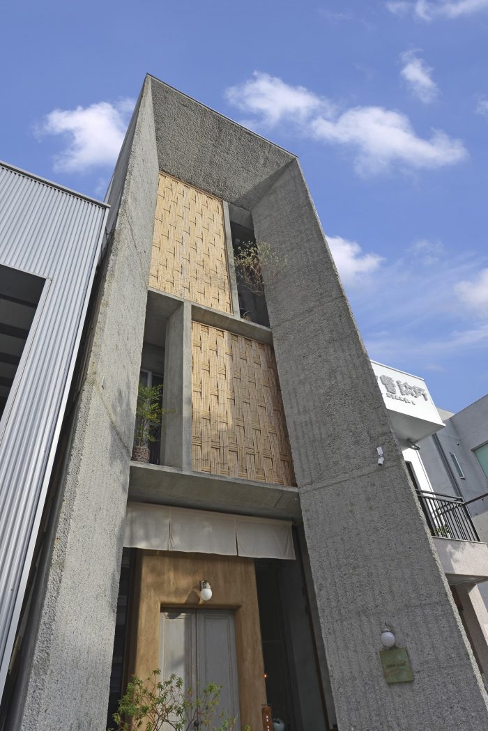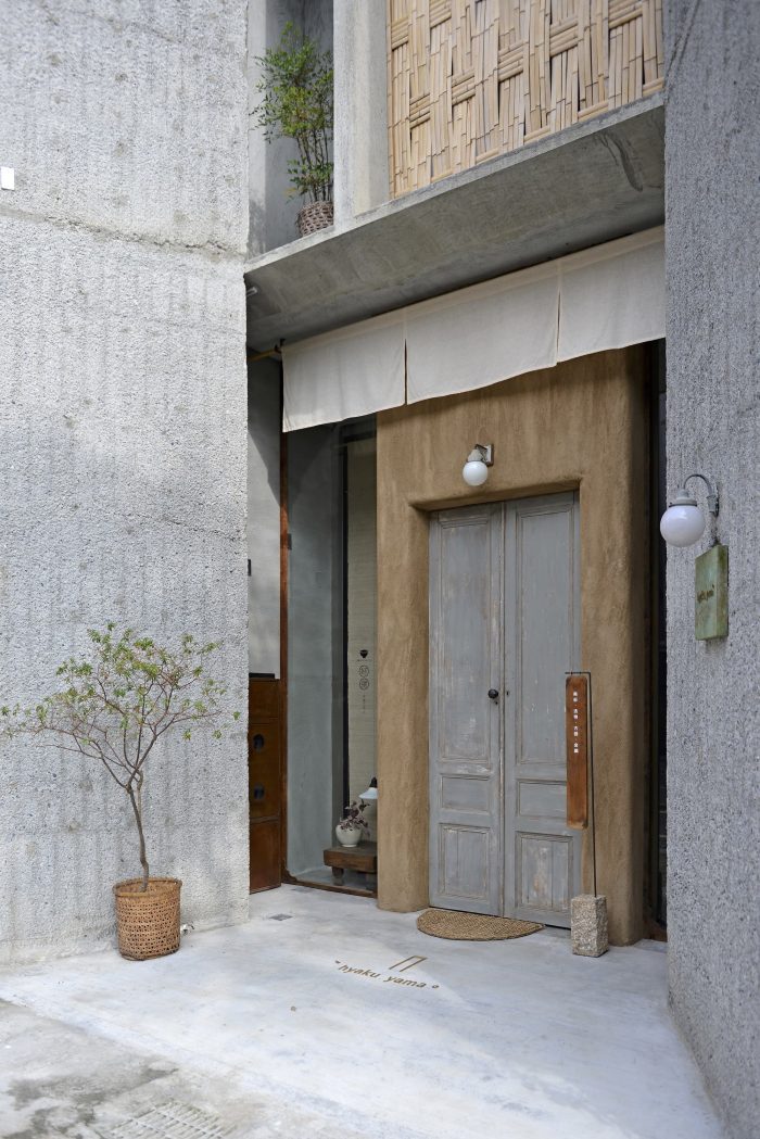 "Hyaku yama" is the Japanese pronunciation of "Hundred Mountains". "Hundred" symbolizes the variety of utensils in the store, and "mountain" is a stone protruding from the ground. The facade of the building is hand-chiseled, and the "ㄇ"-shaped cement exterior wall with rough texture echoes the word "mountain" in the store name.