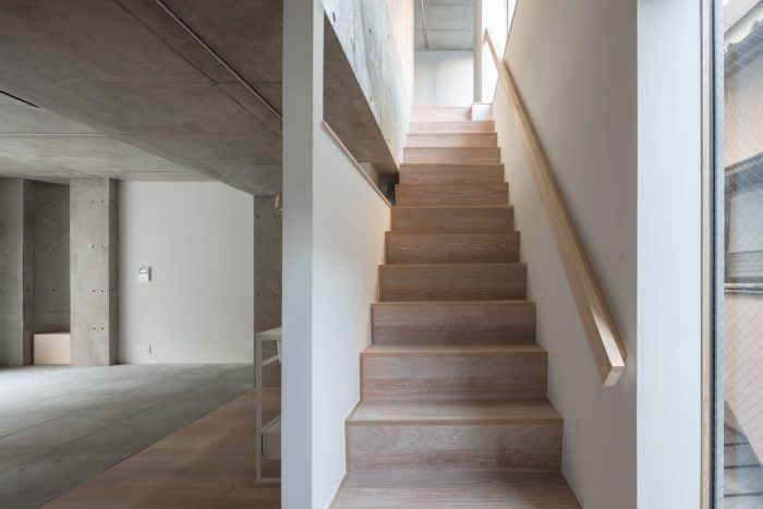 We thought of a design that evolved from the small eaves typical of Okuasakusa, and a structure that would allow changes to the compartments. As a result, we decided on a wall-framed RC structure with two staircases vertically overlapping each other. By reducing the amount of the concrete frame, the building is lighter and has a direct foundation without any piles, which has succeeded in reducing the cost. The interior design, with occasional curved concrete walls to bear the east-west wall volume, and vertical log walls of dry ALC and cedar, creates a living experience of living with walls, rather than the conventional spatial experience of living between walls in apartment buildings.