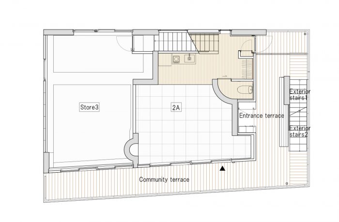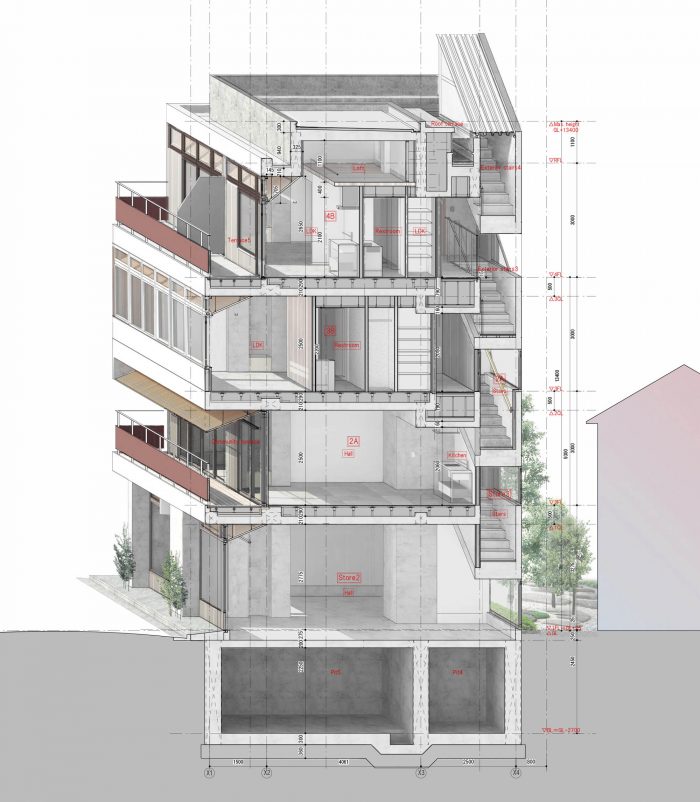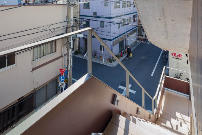 This building is a store and apartment complex in the Oku-Asakusa area, northwest of Sensoji Temple, where the population is aging.By building a 4-floor building without using up the floor-area ratio, the cost of the elevators was allocated to the private areas. The aim was to create a new hub of activity in the area by attracting young people to live and store.