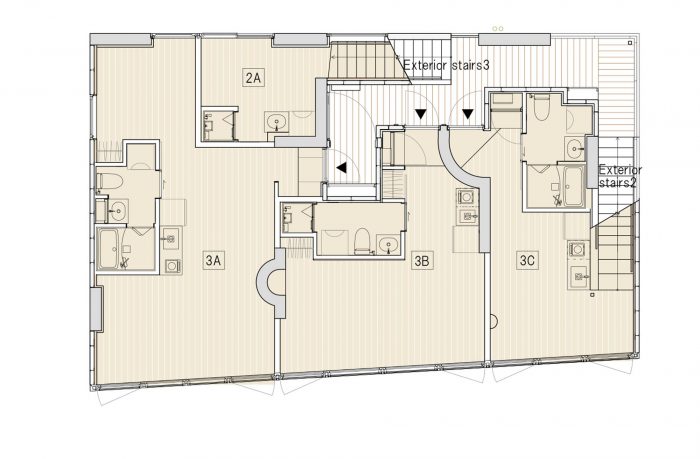 我们想到了一个设计,从Okuasakusa典型的小屋檐演变而来,以及一个允许改变隔间的结构。因此,我们决定采用一个墙体框架的RC结构,两个楼梯垂直重叠在一起。通过减少混凝土框架的数量,该建筑更轻,并且有一个直接的地基,没有任何桩基,这成功地降低了成本。室内设计中,偶有弯曲的混凝土墙来承担东西向的墙体体积,以及由干燥的ALC和雪松组成的垂直原木墙,创造了一种有墙的生活体验,而不是传统公寓楼中墙与墙之间的生活空间体验。