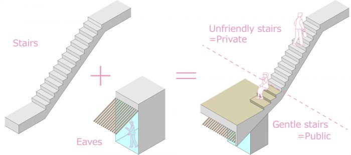 面向十字路口的楼梯和商业与住宅空间相交的公共区域显示在街道上,楼梯的坡度在中间被改变,这样人们就可以在缓坡部分轻松坐下。延伸楼梯坡度的红柏椽子横跨私人和公共区域,柔化了阳光,在夜晚照亮城市。作为这些努力的结果,我们旨在创造一个混合建筑,模糊共享商店和私人住宅之间的界限。