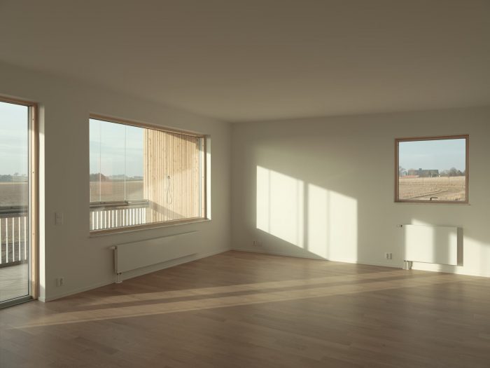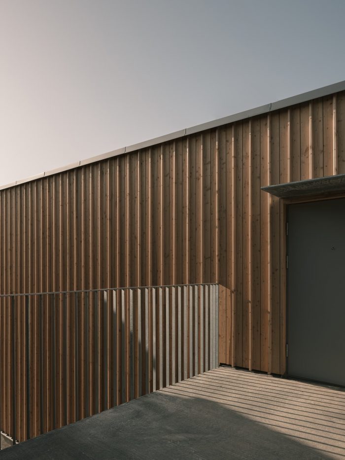 All apartments are double-sided and maintain strong contact with the outdoor environment. Ground-floor apartments have generous patios, while second-floor apartments enjoy large balconies, both of which maintain a pleasant temperature year-round thanks to full-height glass partitions. The internal courtyard, which is framed by an elongated storage building, offers both common and private spaces for the residents. Towards the street, the site’s level differences are used to separate parking spaces and waste facilities from the private patios.