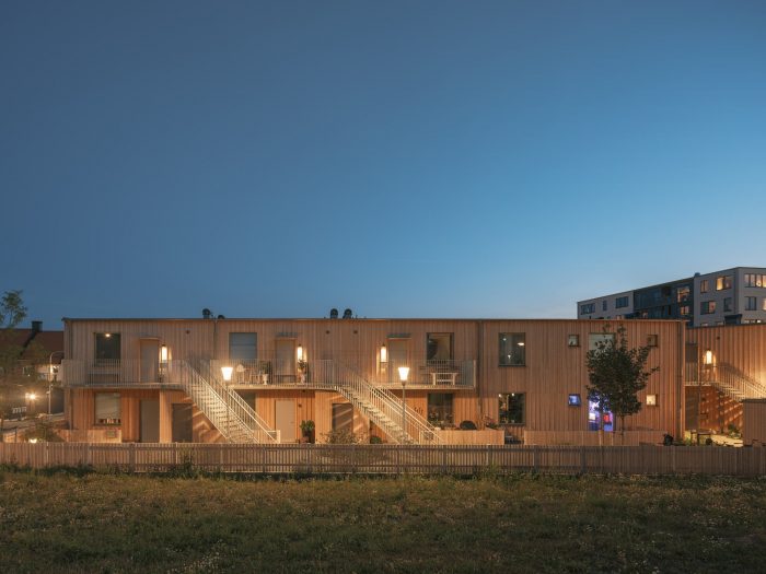 The buildings share a common material language, with balcony railings and stairs in galvanized steel, metalwork details, windows in lacquered aluminum, and facades clad in larch. This material uniformity is augmented through variations in floor plan, window placement, and interstitial outdoor spaces. The intention was to create a harmonious whole with a contemporary design language, where care at the level of materiality and detail is clearly manifested.