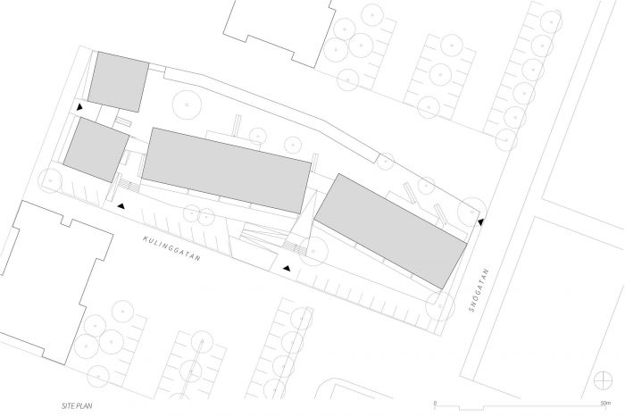 该项目包括四栋两层楼的建筑,总共有20套公寓,平均分为两室和三室公寓。将该项目划分为若干较小的建筑体量,而不是将所有的公寓集中在一个体量中,有许多好处;这种分离行为创造了间隙,使公共庭院有了各种入口,建筑体量也有了相称的规模。独立的建筑体量也能够利用场地的不同轮廓来发挥其优势。