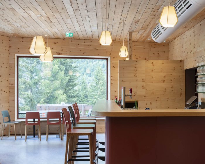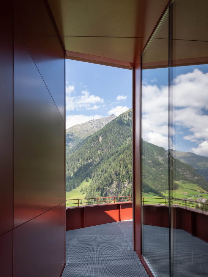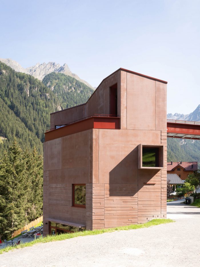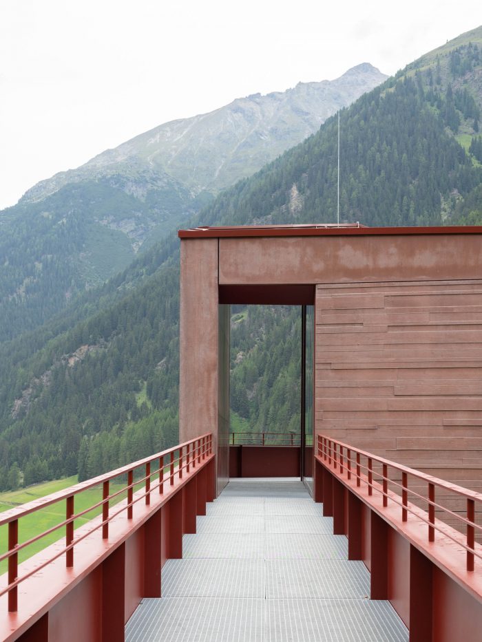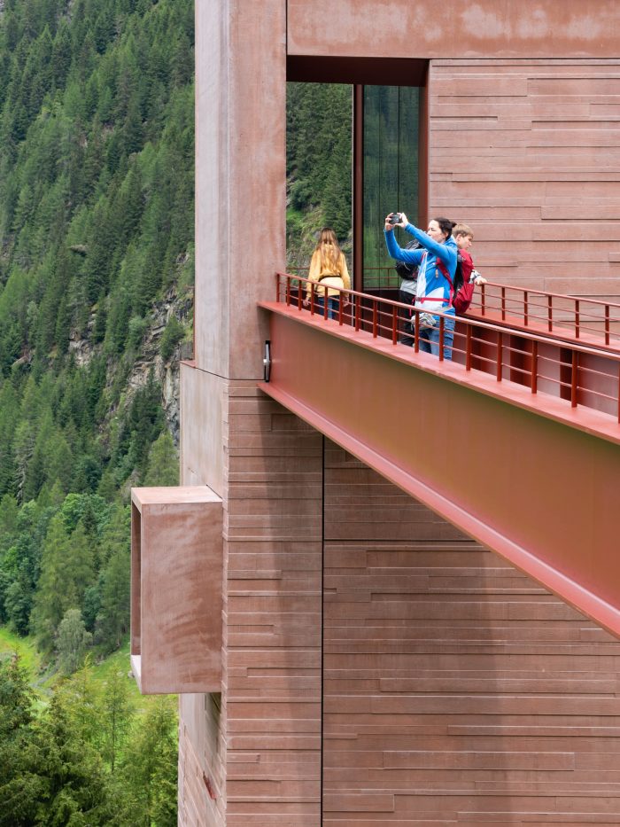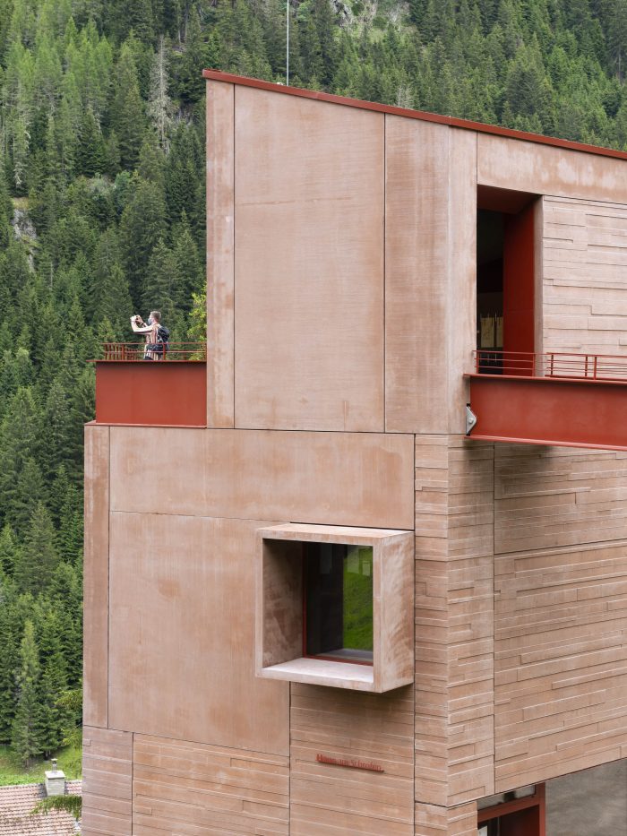 Construction – Materials and Structure. The building is constructed in reinforced concrete, with prefabricated concrete elements as the facade. The window frames and the bridge are made of steel, coloured in red, Terrazzofloors in a reddish-grey, and the stairs in oak. The restaurant is paneled in stone pine, the typical wood of this mountainous area.