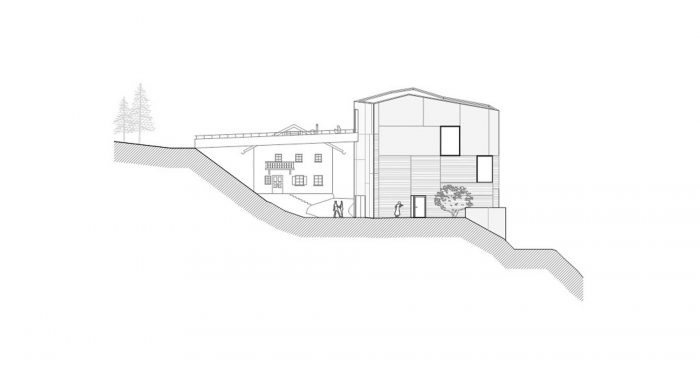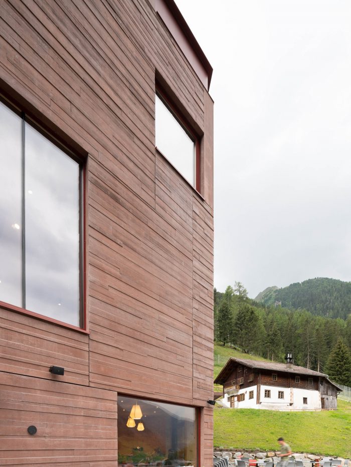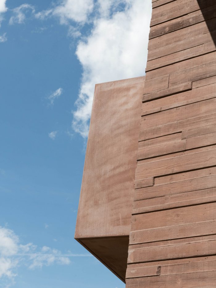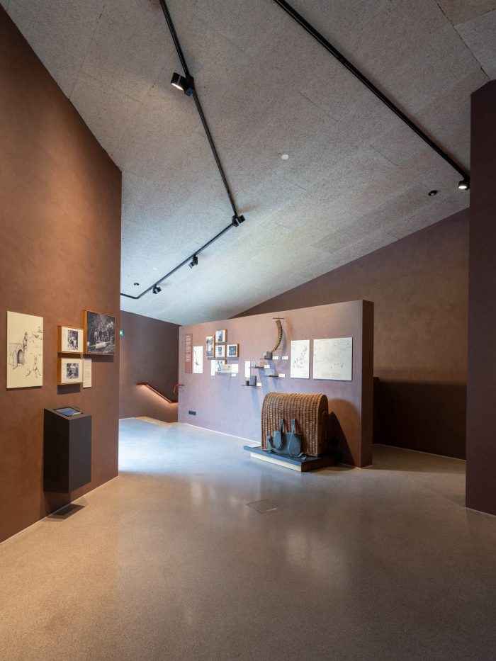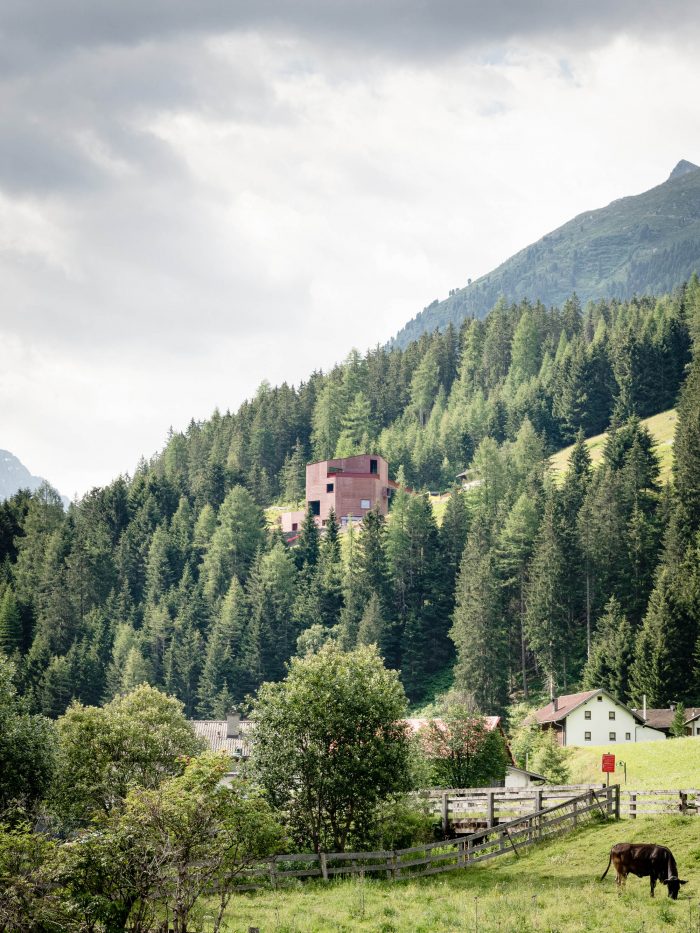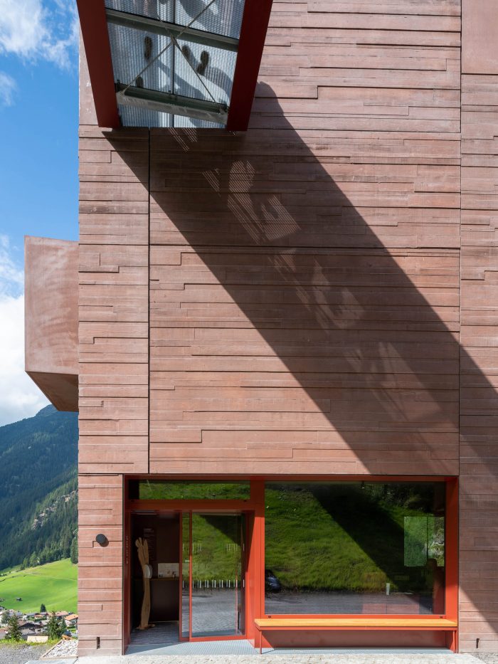 Upon a wooded mountainside, you see a reddish building, somehow appearing like a small castle. It is the Ibexmuseum St.Leonhard. Right next to one of the oldest farmhouses of the valley, with nearly the same footprint of the old barn which was standing there, a towerlike building has been constructed in precast concrete, where the lower parts are quoting the wooden surface of the barn.