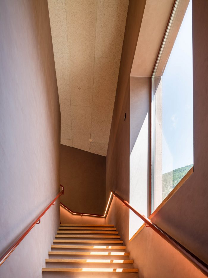 建筑--材料与结构。建筑采用钢筋混凝土结构,外墙采用预制混凝土构件。窗框和桥体采用钢结构,颜色为红色,Terrazzofloors为红灰色,楼梯为橡木色。餐厅用石松木镶板,这是这个山区的典型木材。