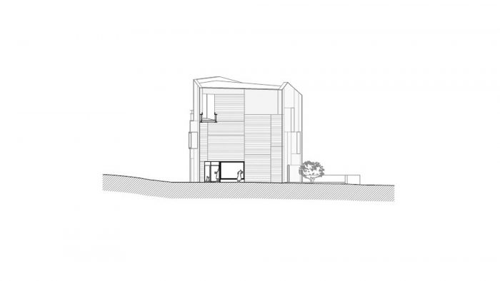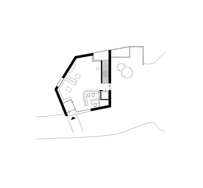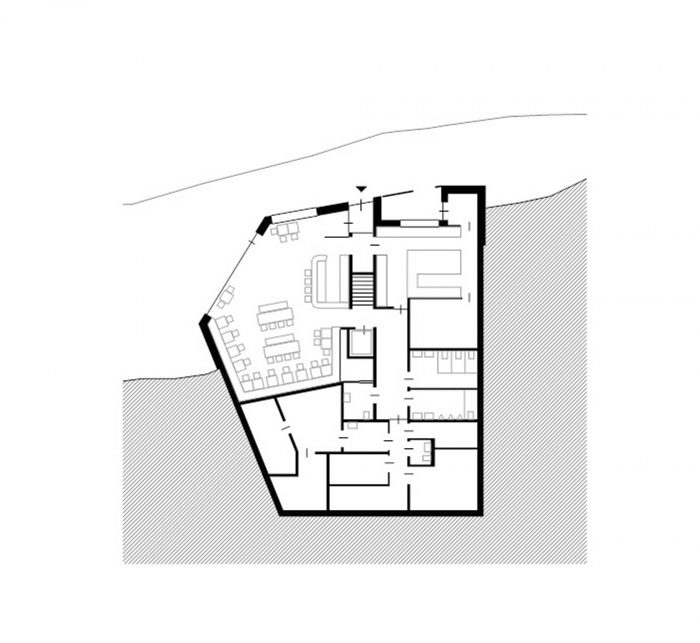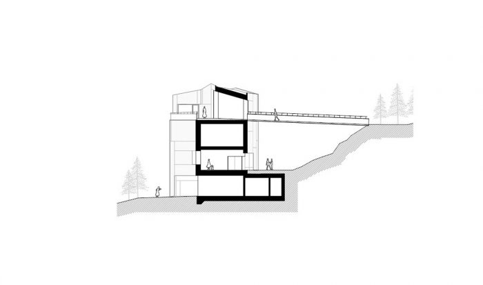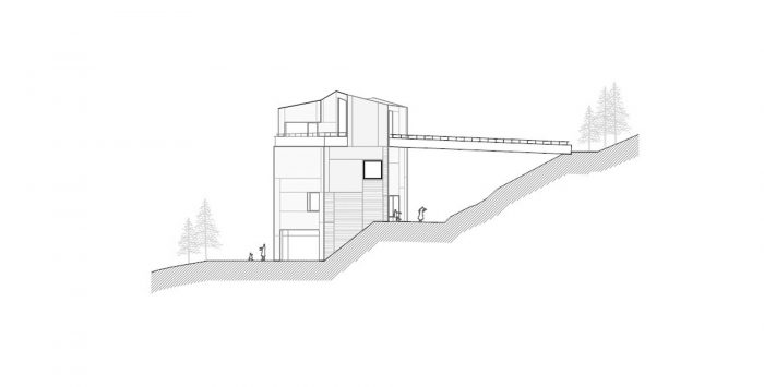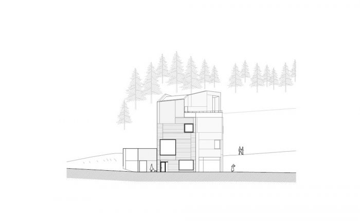 Concept Context and Strategy. A clear tower-like building representing a landmark has its reason in the site, which is visible from the small village below. Its compactness, the position, and the concrete façade with a formwork of rough wooden boards could be seen as a memory of the old barn.