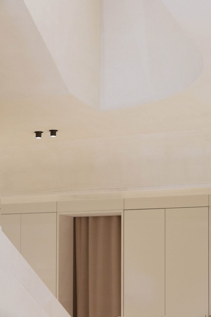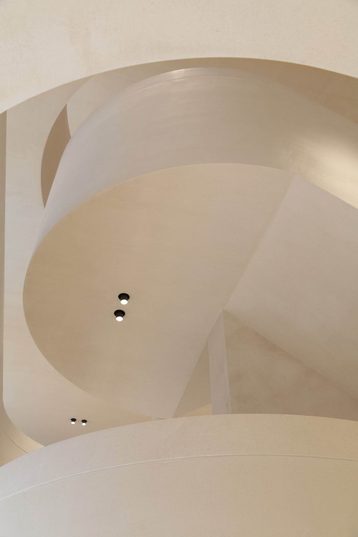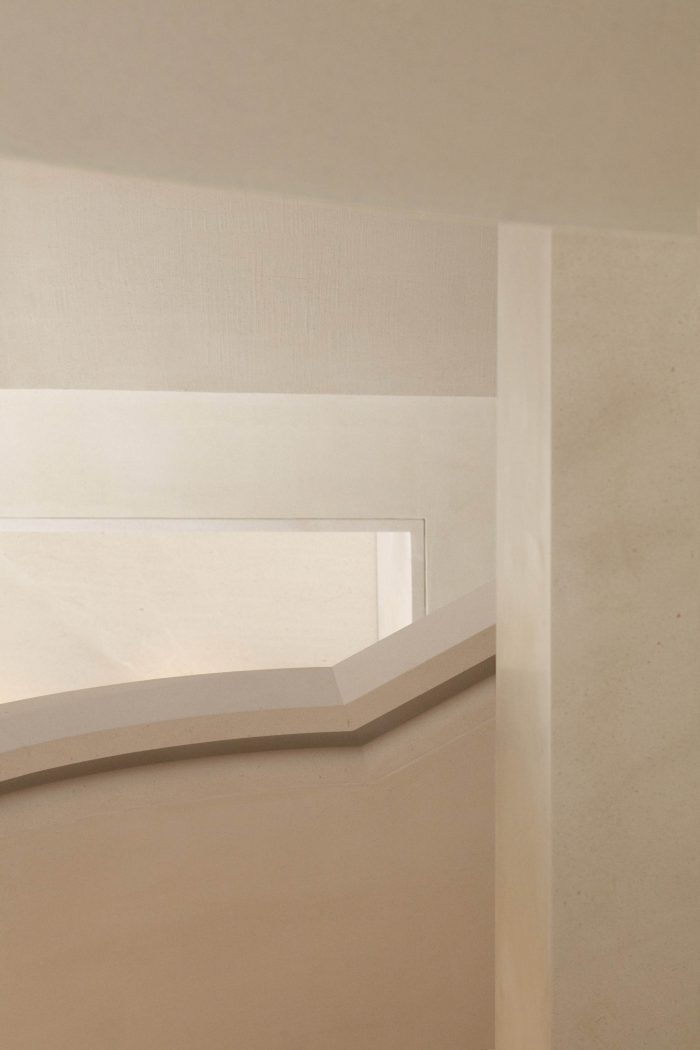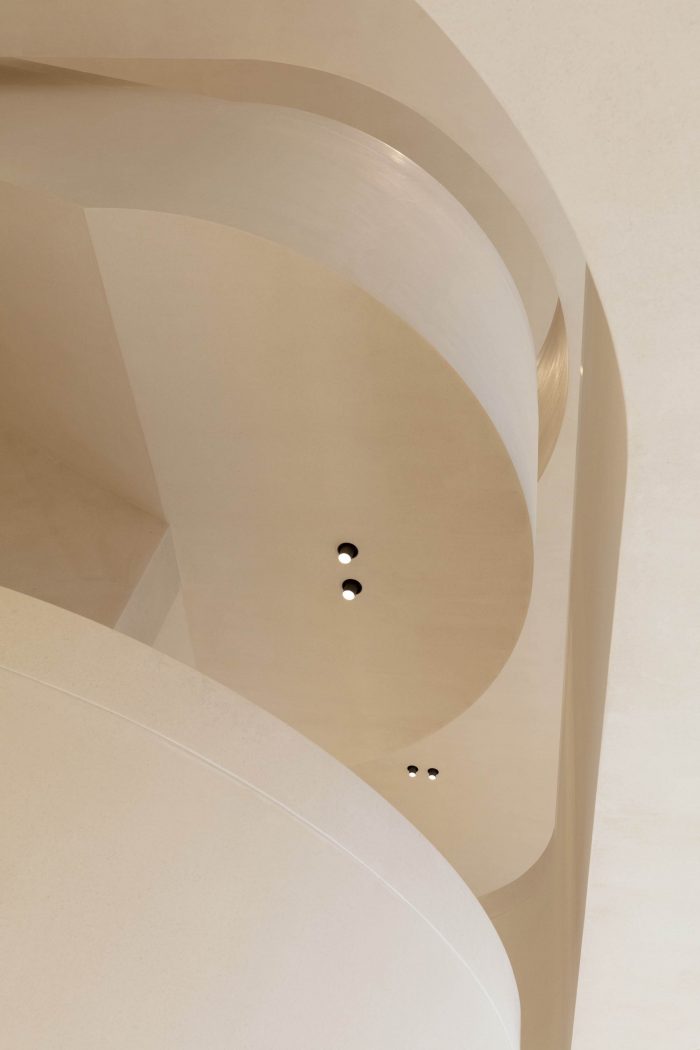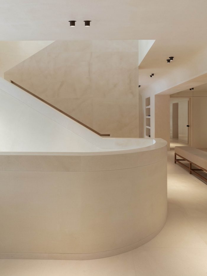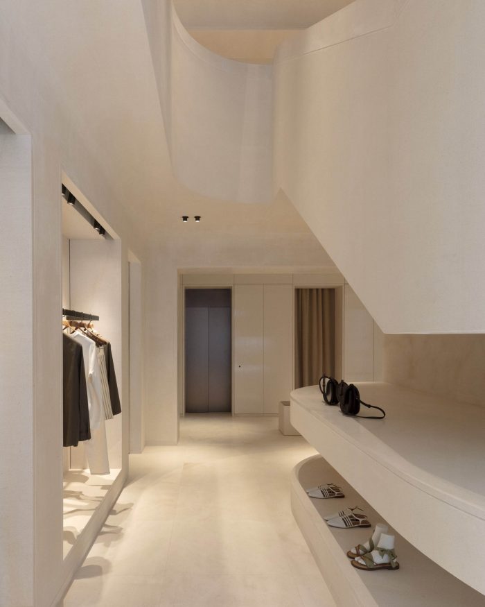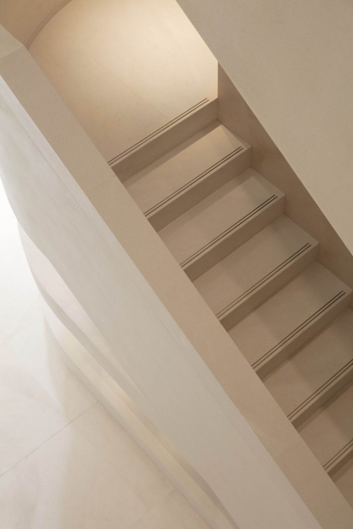 A sense of openness greets the visitor, with soaring volumes and, at the store’s center, a monumental staircase that flows organically from the ground floor to two upper levels. Paloma limestone flooring, architectural details, and tonal wall and ceiling treatments reinforce chromatic continuity and a sense of unity, creating a serene showcase for ICICLE ready-to-wear and accessories for women and men.