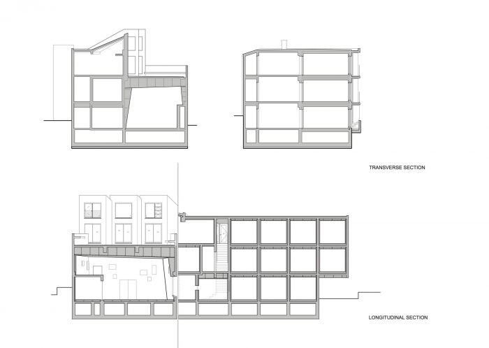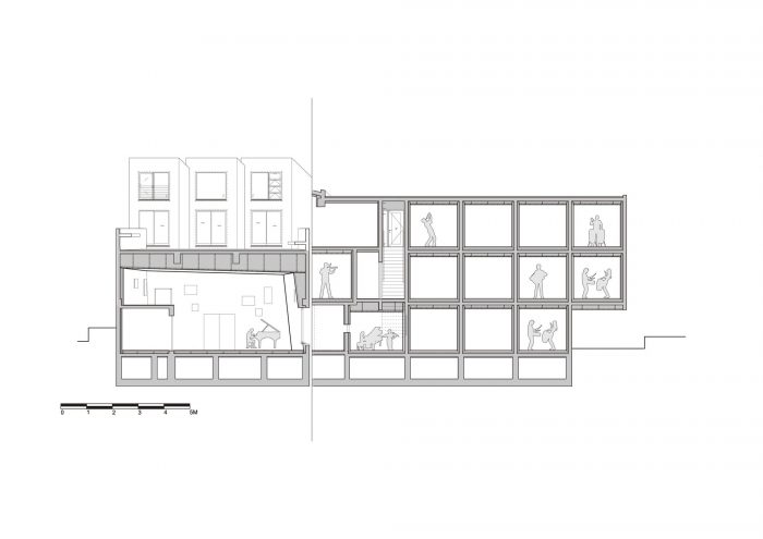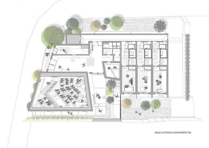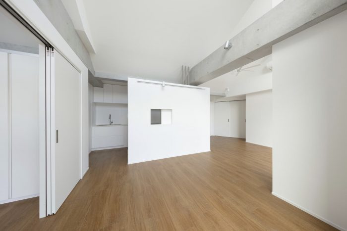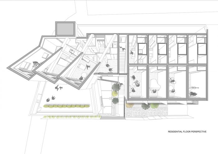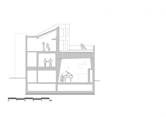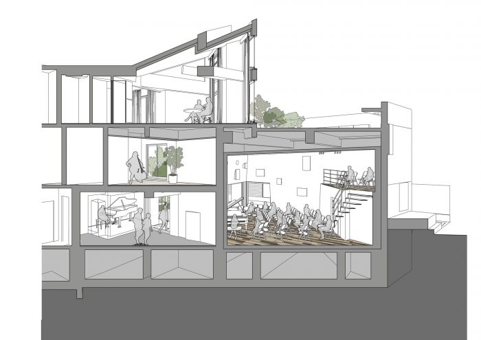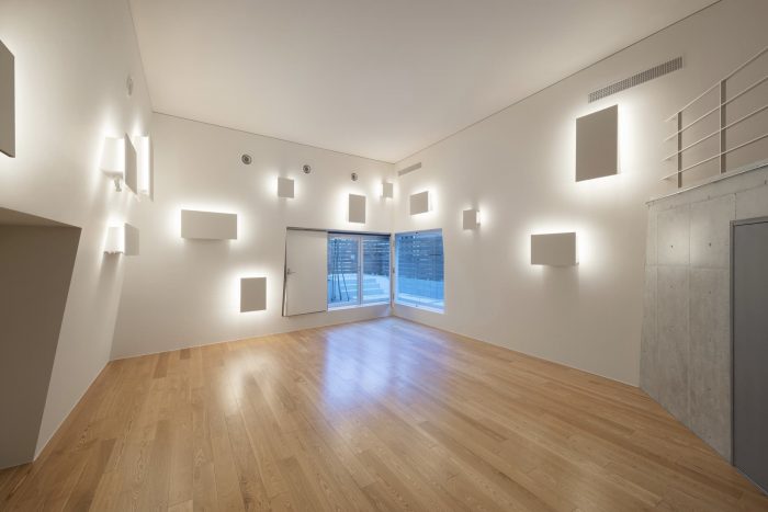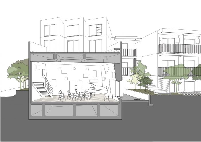 Spatial reconfigurations - Towards the center of the building, the residential zone shares its entranceway with the music hall, and is accessed via a staircase marked by architectural elements symbolically paying tribute to the climb to the Ikegami Honmonji temple. At the top of the staircase, a series of sound-proofed rental homes line the corridor, each comprised of a kitchen, bathroom, soundproofed living room, and sleeping quarters. The residential volume also houses a penthouse unit comprising three-volume areas featuring sliding walls that enable maximum spatial configurations of its spaces. By reconfiguring the sliding walls, the living room and dining room areas can be enlarged to accommodate a variety of logistical situations. The sleeping quarters can also be reconfigured from a master bedroom into multiple bedrooms to accommodate other family members or houseguests.
