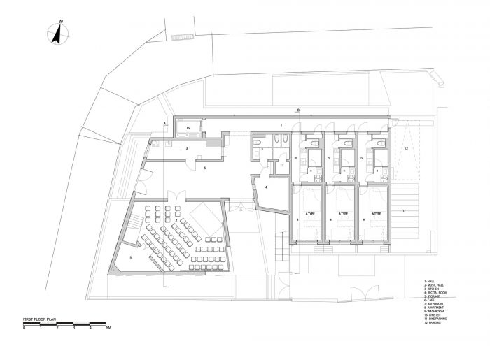 A seamless blend with the environment - To the northwest of Ikegami’s largest cluster of residences, the complex sits on a trapezoidal site, just east of the town’s temples and cafes that cater largely to migrant waves of pilgrims en route to the temple. The two-story music hall and its 80-seat theatrical auditorium occupy a strategic place in the southwest corner of the structure, entered via a vestibule and foyer that combine to form a circulation zone that blurs the lines between the inspiring, undulating hills of the external landscape and the vibe of creativity that awaits inside. The foyer is embraced by three brass-colored, stainless steel diagonal walls, and the interior of the hall is encased in acoustic reflectors, with large walls that collectively form an abstract diagonal shape. Glass surfaces and multiple entranceways further embolden connections between the music hall and the surrounding landscape, with the latter embellished by gabion walls that delineate a garden of various species of plants.