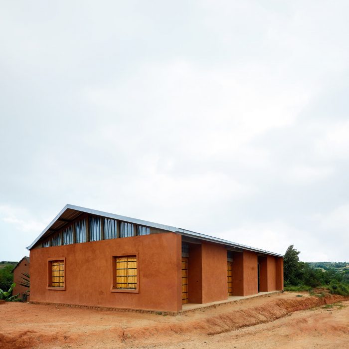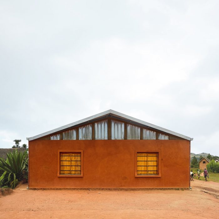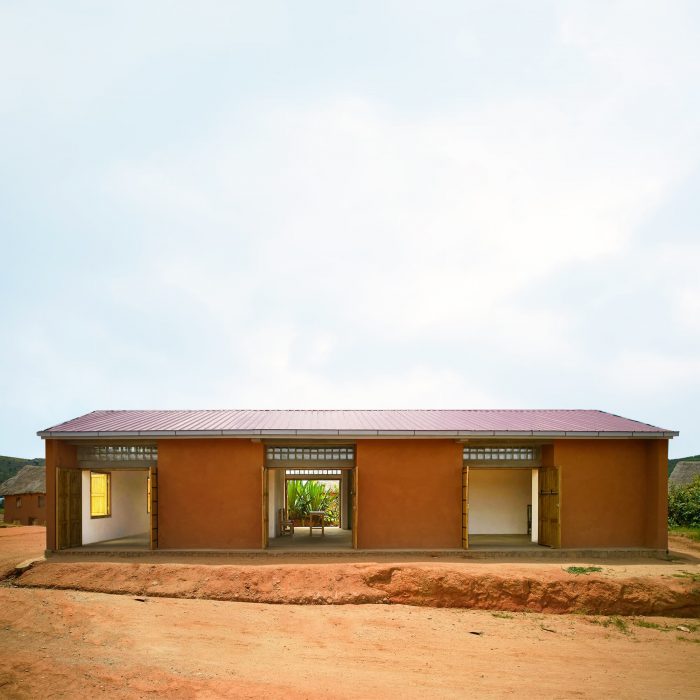 The edifice seeks to blend in the existing urban fabric by using traditional methods to coat its facade. The typical red earth found on site is mixed with cement to create the particular color that can be found on the surrounding houses.