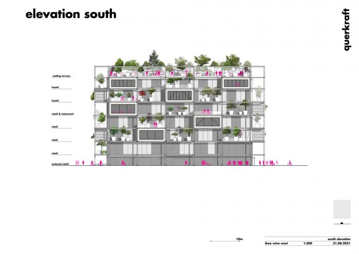 60 trees on and around the building. Trees on the facade and on the roof have a perceptible impact on the microclimate. As the trees could be placed at different heights and depths in the building there is more planting than would be possible on the building’s ground area. In the “Urban Heat Island-Strategy Plan“ of the City of Vienna planting is one of the most important measures. The climbing plants and trees of the IKEA furniture store have a cooling and humidifying effect – like a kind of natural air conditioning system. The air temperature will be improved at the pedestrian level, too. Computer simulations indicate a relevant temperature decrease of 1.5°C.