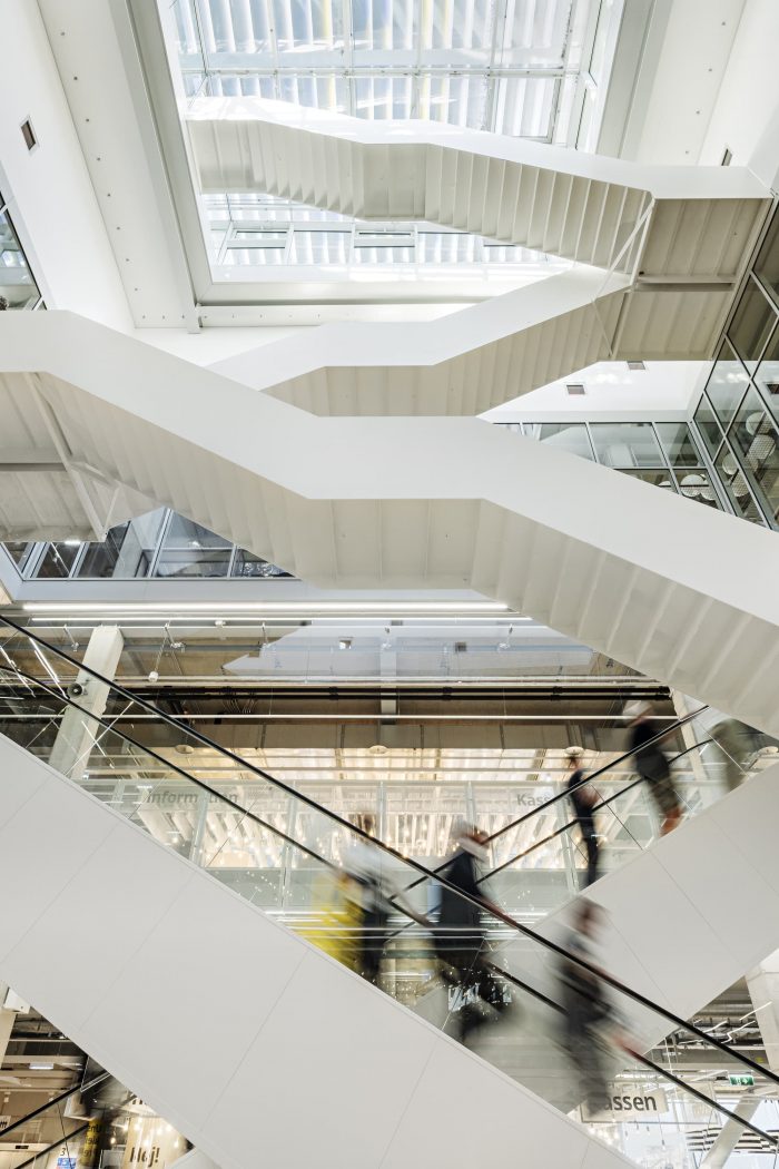Mix of functions through open floor plans. The prefabricated reinforced concrete columns stand on a c. 10 x 10-meter grid that allows flexibility in the use and design of the spaces. Adaptations to meet changing demands can be made easily, as is already becoming apparent. IKEA retail occupies the lower floors, and the Jo&Joe Hostel with 345 beds is located on the top two floors. This mix creates a building that is alive 24 hours a day, 7 days a week.
