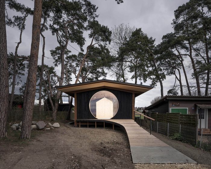亭子像一只鸟一样站在湖边,用精致的金属脚站在地面上,这种方式反映了它在湖边的处境、水、时间和旅行。这些镀金的、闪亮的脚可以保护岛屿之家免受恶劣天气的影响。房子的主要入口是通过一个大的、弯曲的坡道,将亭子向湖边的人行道延伸,伸向岛对面的游客。它由许多垂直的木板组成,并在金属脚上凸起,就像一个木制码头,其弯曲的形状和对比强烈的色调让人联想到涉水者的尾巴。混凝土基座界定了潮湿的土地和高于地面的木材之间的过渡。