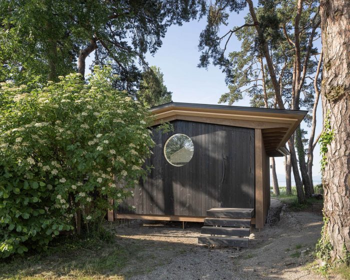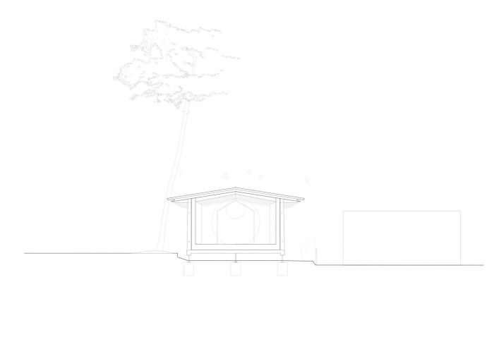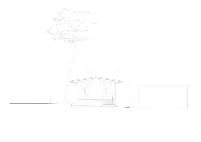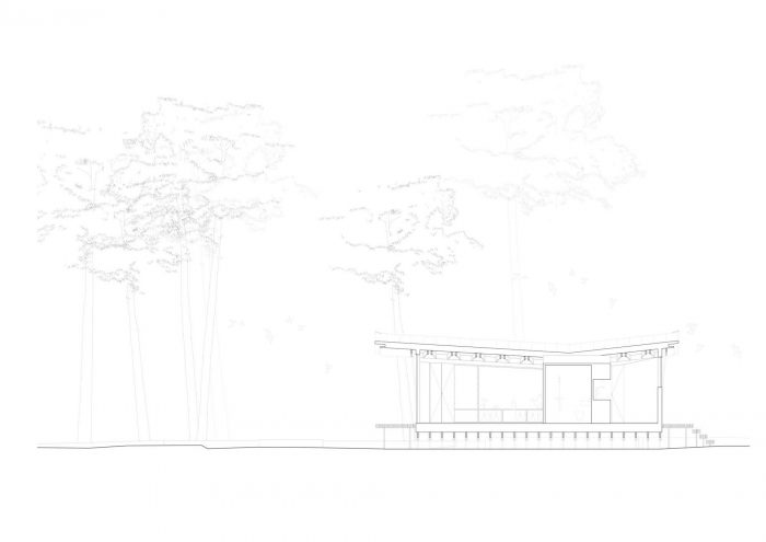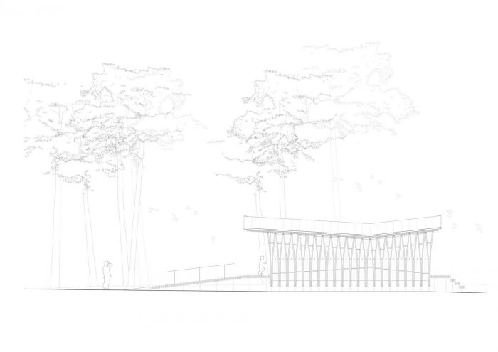 The roof is generously sized, with large eaves. It consists of layers of wood formed of thin cross-laminated panels and covered with black zinc cladding. The superposition of thin layers of wood lightens the airy, open-to-view roof structure, creating an impression of suspension and movement – an effect accentuated by the way the roof shape curves. The light form of the roof also has a footprint designed so that it slips between the very old Scots pine trees standing on this plot of land. In this way the pavilion blends very sensitively with its surroundings, causing no disturbance to the pre-existing ecosystem.