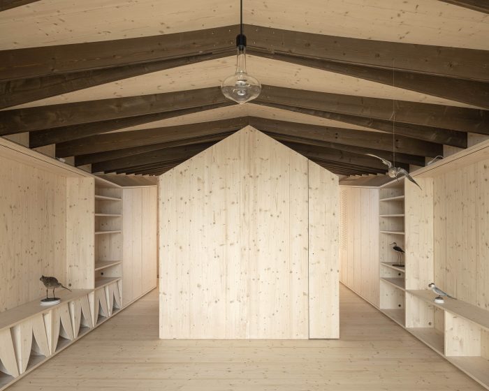 Analogue Architecture / Structure. The architecture of the bird island house draws inspiration from the elegance of the bird world (twig, nest, feather). Its structure is composed of solid vertical boards, assembled without glue, that have been bent to form a lacework structure of ogival elements suggesting the tension and delicacy of a nest. The ogival boards that support the roof run across the building, ornamenting the internal ceiling. Inside, visitors find a basic, warm space, covered with a light-coloured natural pine wood that contrasts with the darker framework of the building.