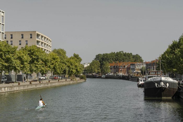The first area to be completed of the Rives de la Haute Deûle development zone is a former post-industrial wasteland stretching over 100 hectares, located on the western edge of the city of Lille. The terrain, marked by largely varying scales between existing industrial, religious, and residential buildings, lies along the Deûle canal. The canal provides a gentle demarcation between this neighbourhood's southern and northern parts, both undergoing major urban renewal. The presence of a waterway, a powerful element in the landscape, is an important and enhancing asset.