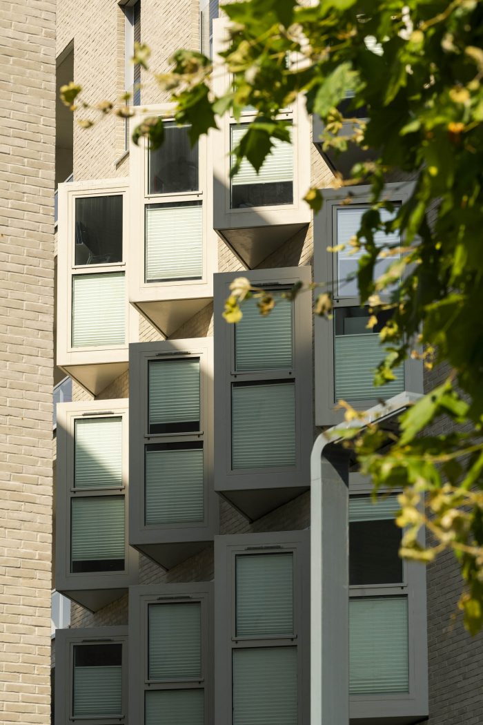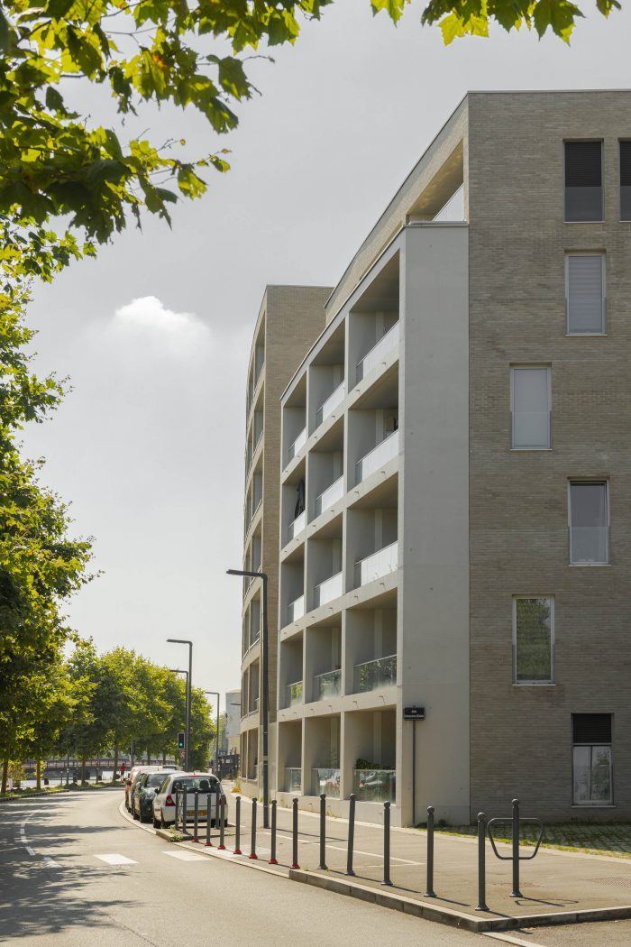 The two residential buildings are to the south of the site, with 47 social housing units for rent (building A) and 23 units for sale on the open market (building B). They stand out with their curving facades, which follow the sinuous line of the canal. The project dialogues harmoniously with the existing environment through the careful selection of contemporary materials, such as pale beige bricks, coloured grouting, natural anodised aluminium and glass. Protruding volumes, known as 'spines', are a modern reinterpretation of industrial bay windows and provide each apartment with direct views over the Deûle.