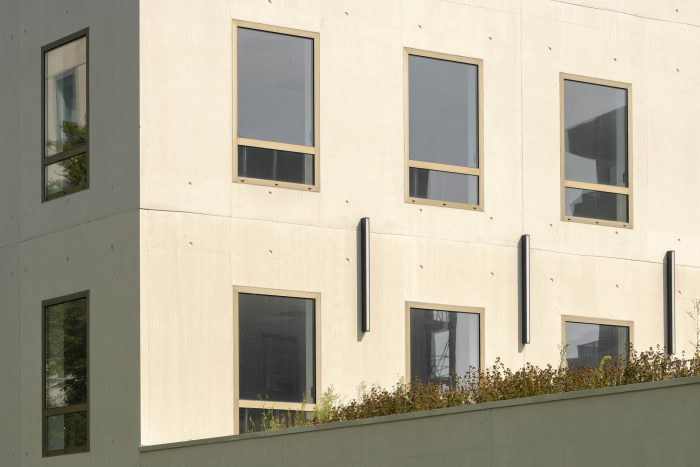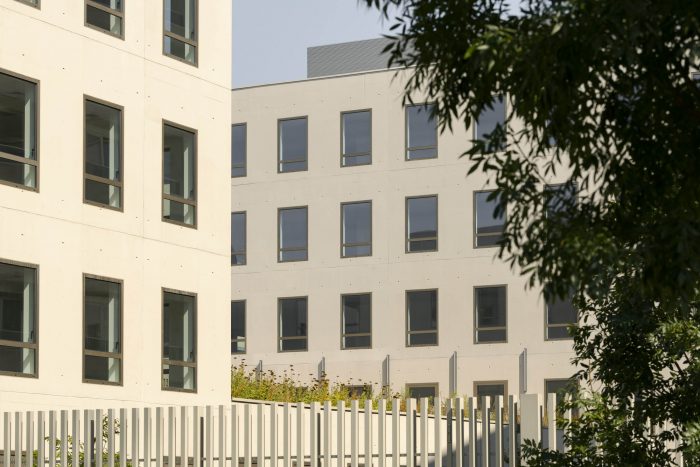 To the north of the site, the two office buildings (buildings C and D) provide extensive floor plans (800m2 and 420m2 respectively). Both buildings have been awarded 'good' BREEAM environmental certification for their energy performance. Characterised by pale grey glazed concrete facades with windows in bronze anodised aluminium, the offices reflect the beige tones of the neighbouring brick buildings.