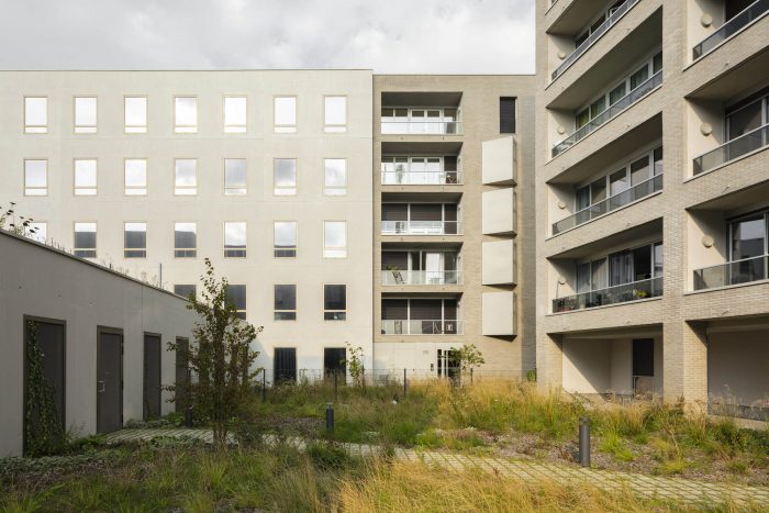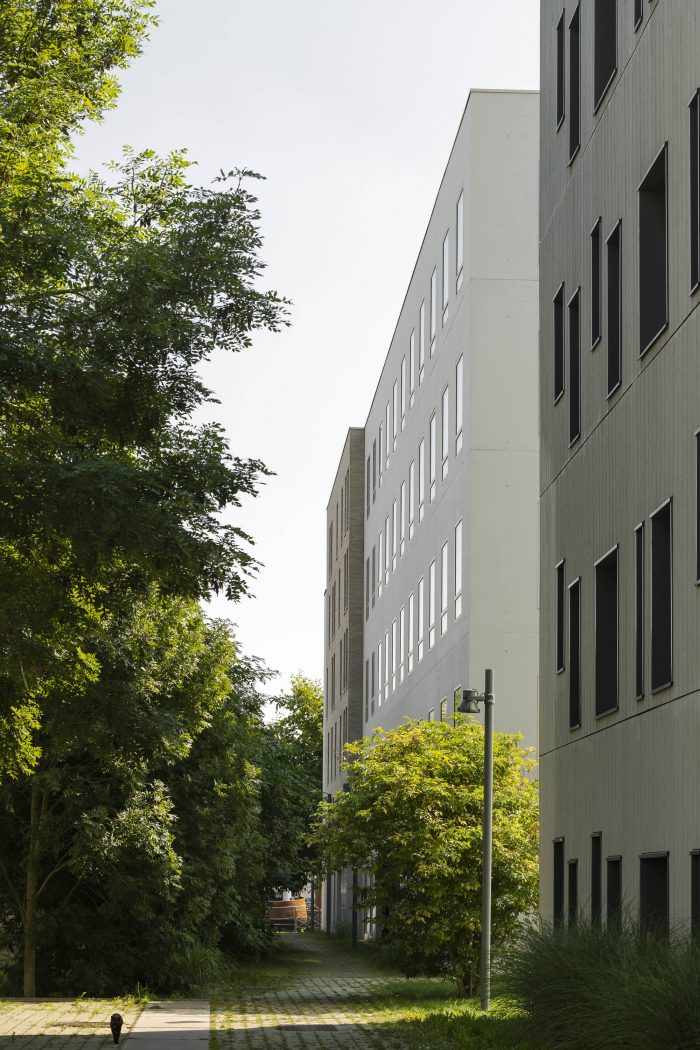 The surrounding vegetation, consisting of a variety of ground cover plants, perennials and grasses, is typical of the Haute Deûle district and extends into the middle of the block. The green space on the ground level incorporates paved paths for easy pedestrian circulation.