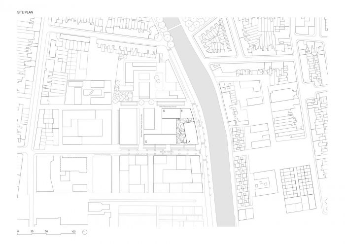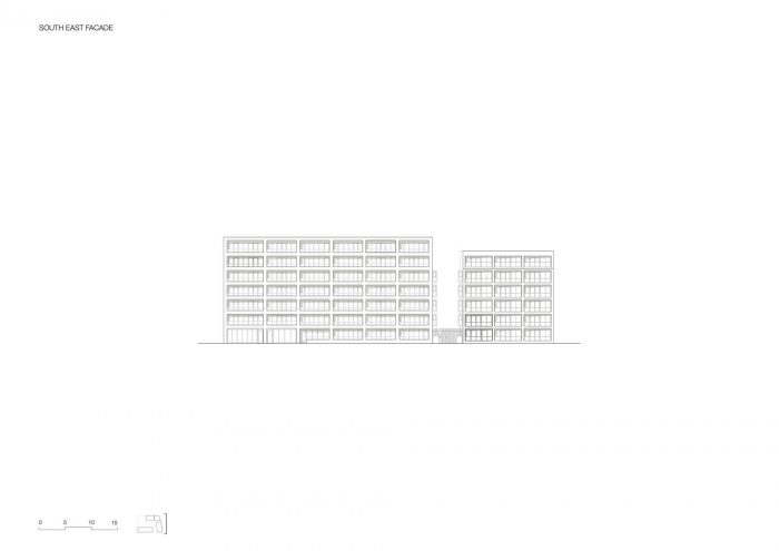 在场地的北部,两座办公大楼(C楼和D楼)提供了广泛的楼层规划(分别为800平方米和420平方米)。这两座建筑的能源性能都获得了英国建筑性能评估体系的 "良好 "认证。这些办公室的特点是淡灰色的玻璃混凝土外墙,窗户是青铜色的阳极氧化铝,反映了邻近的砖瓦建筑的米色色调。