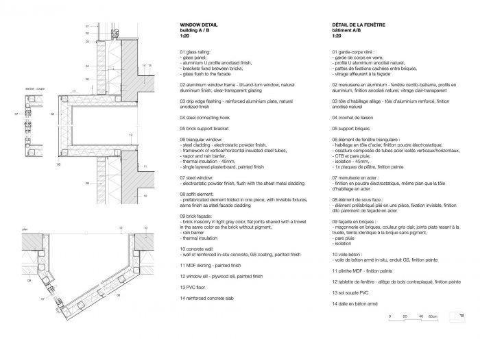 两座住宅楼位于场地南部,有47个社会住房单元用于出租(A楼),23个单元用于公开市场销售(B楼)。它们以其弯曲的外墙脱颖而出,沿着运河的蜿蜒路线。该项目通过精心选择现代材料,如淡米色砖、彩色灌浆、天然阳极氧化铝和玻璃,与现有环境和谐地对话。突出的体量被称为 "脊柱",是对工业窗台的现代诠释,为每套公寓提供了直接的Deûle景观。