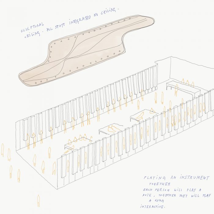 A light signal will indicate when to press the designated key so that people, whether alone or in groups, can all play together in perfect harmony. "This space is a tribute to peace, love, and unity, and it will be the first one in the world where people will be able to play a song using the furniture, that will also act as shelves to display the product. I imagined this place as a temple, a moment in time where not only you are here to shop but also share an instant" states Javier Zubiria.