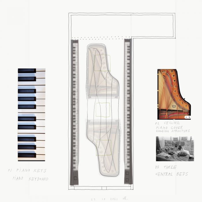 At the center of the shop, people can experience the space while sitting on a giant white squared bench, a nod to John Lennon's two weeks Beds-in far peace protest. To complete this art-exhibit-like experience, the ceiling welcomes an incredible piano lid shape sculpture, beveled throughout the entire 20 meters deep showroom. A music instrument within which you can shop Each piano key is actually true to its function. Thanks to a sensor connection, visitors are invited to collaborate, create or interpret the perfect song.