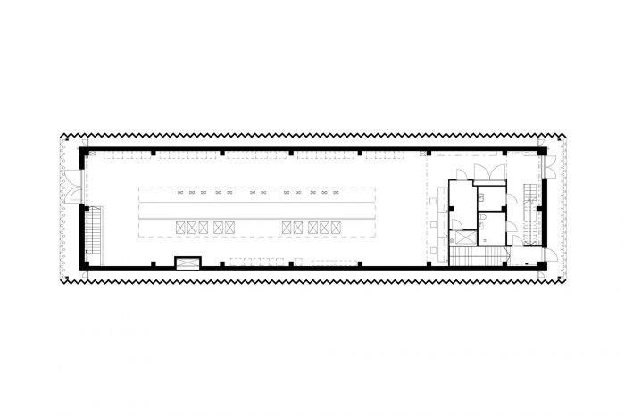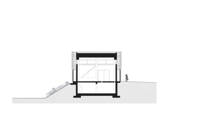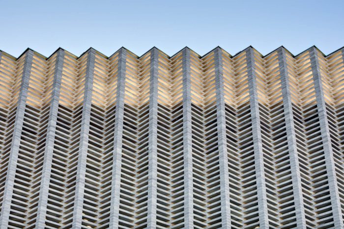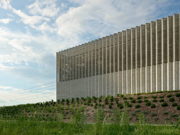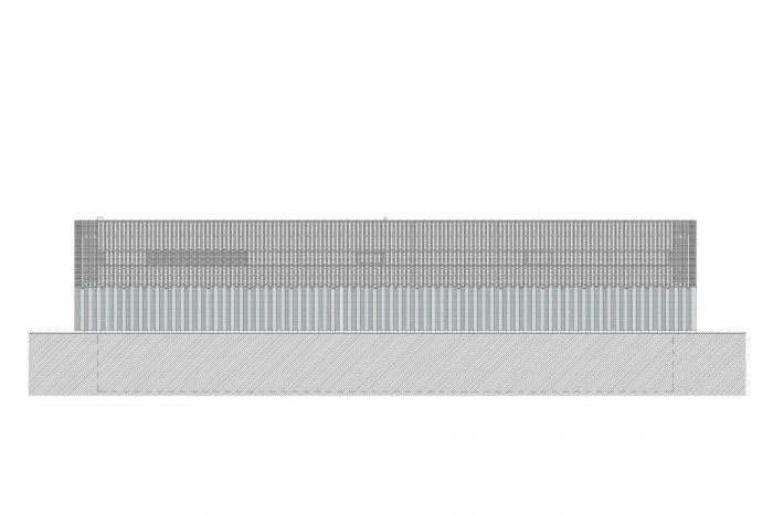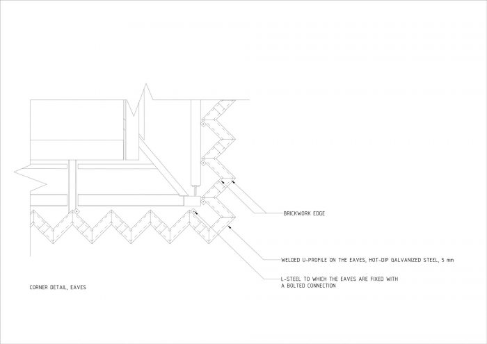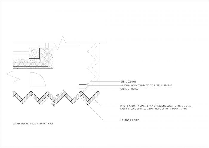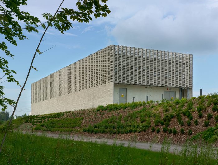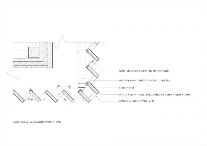 The new substation building has a concrete frame and double-skin facades. The outermost facade layer consists of hand-made long bricks laid in a zigzag profile, a motif which the building shares with the triangular steel profiles of the new powerline towers and terminals. The inner layer of the double facade consists of in-situ and prefabricated concrete walls cut by a continuous strip window set behind the brick lattice.