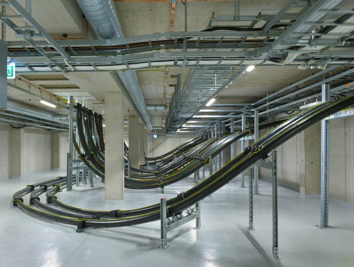 老水电站建筑的红砖包覆外墙的突出特点是窗台和门的有节奏的排列。节奏也成为新变电站外墙和电力线结构的主要特征。1929年建成的老式空气绝缘开关设备即将结束其运行周期,必须用安装在新的变电站建筑内的气体绝缘开关设备来取代。