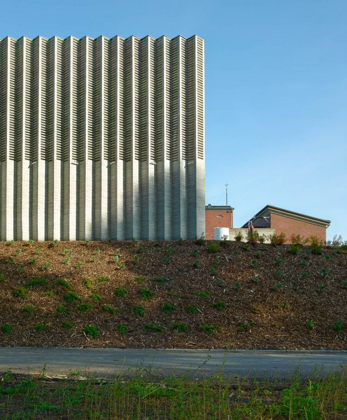 New powerline structures replaced old lattice-type towers to the east and west of the new substation. Besides the location of the new powerlines, the scale and coordinates of the old hydropower plant buildings were primary factors in the positioning and layout of the new substation building. The lower floor of the substation is set underground to match the height of the nearest section of the old power plant. The design of the new transmission structures also seeks balance with the built and natural landscape, with all but one tower being lower than surrounding trees.