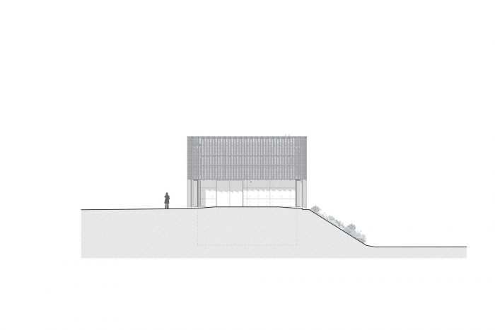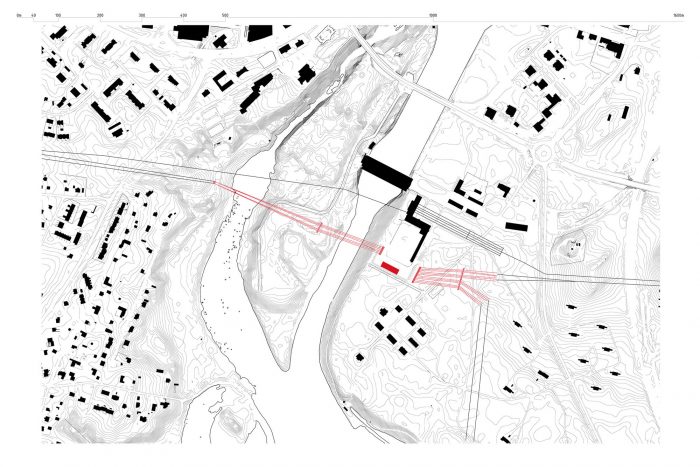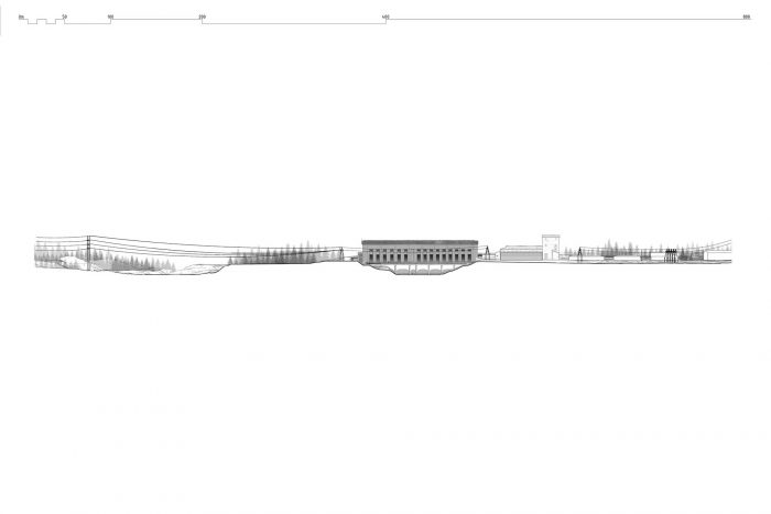 新的电力线结构取代了新变电站东部和西部的旧格子型塔楼。除了新电力线的位置,老水电站建筑的规模和坐标也是新变电站建筑的定位和布局的主要因素。变电站的低层设置在地下,与老电厂最近的部分高度一致。新的输电结构的设计也寻求与建筑和自然景观的平衡,除了一个塔楼外,其他都低于周围的树木。