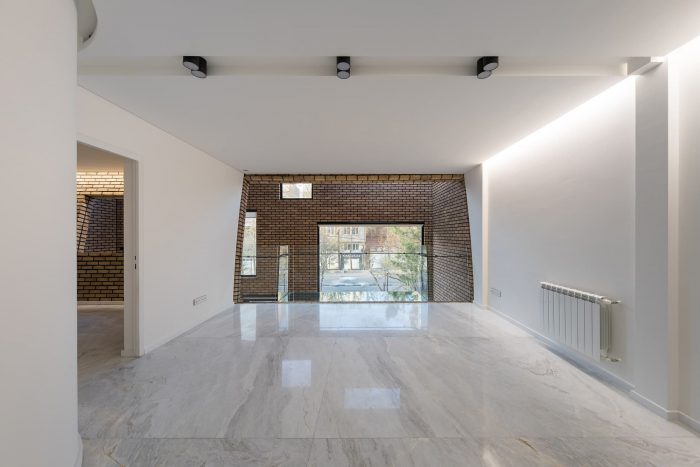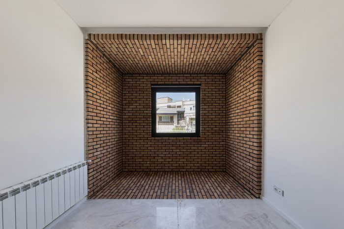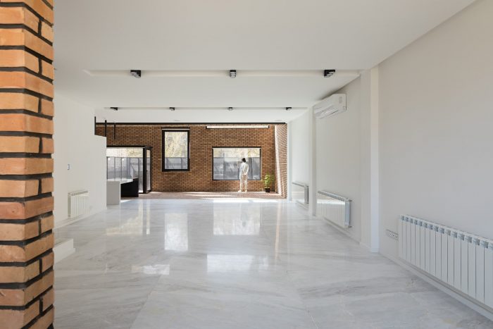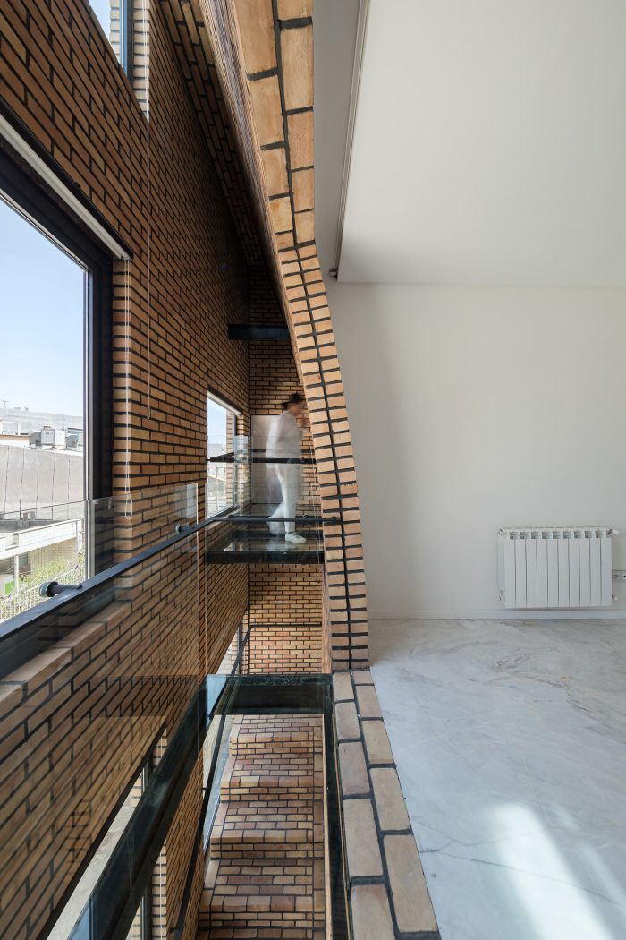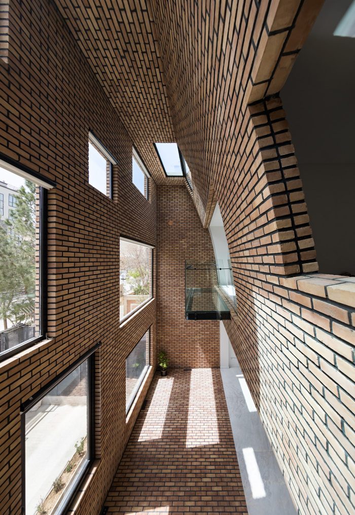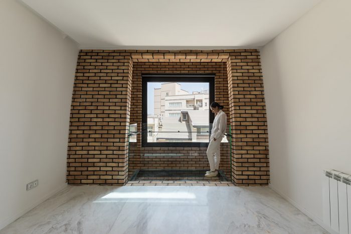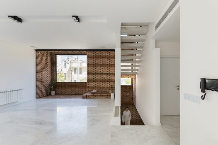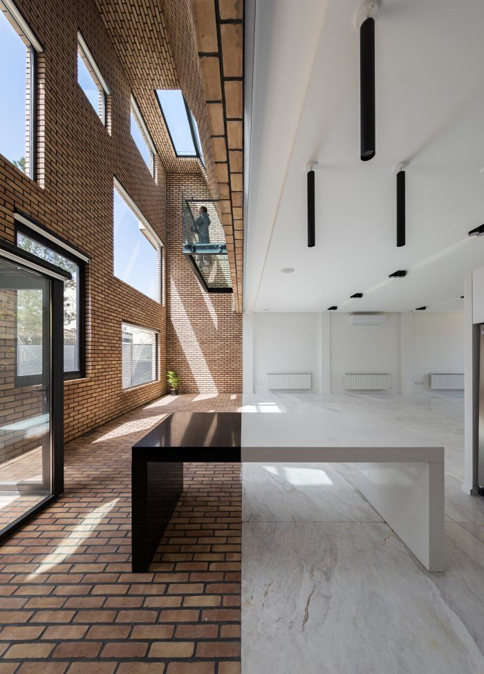 The dialectic of the empty spaces with the warmth of the brick’s color texture alongside the view to the outdoors and the sky and intermediate white living space has created a special attraction. The use of glass terraces in these empty spaces, in addition to emphasizing the empty spaces, has allowed for the experience of being in the middle of the ground and the sky for the residents.