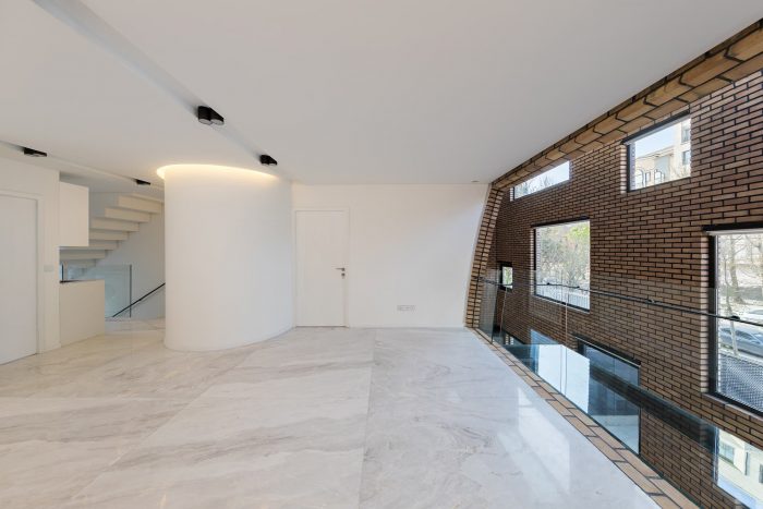 空旷的空间与砖的温暖的颜色纹理,与户外和天空的景色以及中间的白色生活空间的辩证关系,创造了一种特殊的吸引力。在这些空旷的空间里使用玻璃露台,除了强调空旷的空间外,还让住户体验到身处地面和天空中间的感觉。