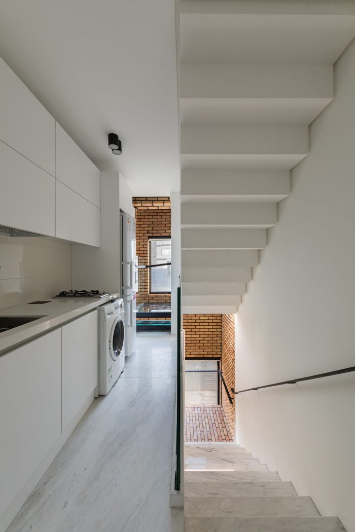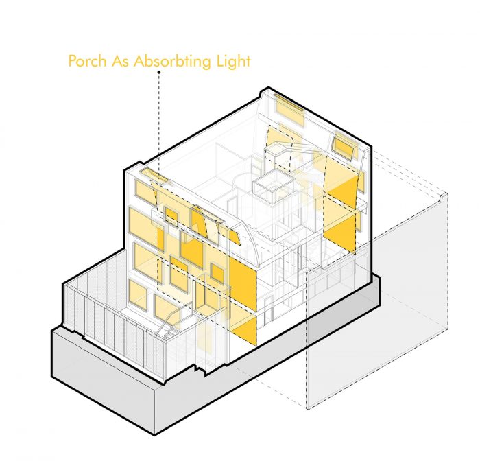 现在,在传统的房屋中,室内和室外的界限是由墙壁和门窗等门槛设置的,允许人们进入和出去。在本项目中,由于在房子的两边使用了两块砖的空间围合,边界变成了两个可居住的空旷空间。两个半开放/半封闭的门廊,是家庭与街道/小巷的中间生活空间。这两个空旷的空间揭示了室内和室外、天空和地平线之间的关系,同时,也连接了各楼层。
